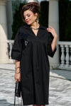 Блузка прямого силуэта с центральной застёжкой на петли-пуговицы по планке, отложным воротником рубашечного типа. По переду блузки отрезная кокетка и декоративные клапаны кармана из отделочной ткани. По спинке блузки отрезная кокетка из однотонной ткани. Линия плеча спущенная. Рукав втачной, короткий из ришелье. В боковых швах блузки разрезы. Воротник, планка, кокетка переда и спинки блузки, клапана карманов выполнены из отделочной однотонной ткани- джинса, который гармонично сочетается с основной тканью- ришелье.