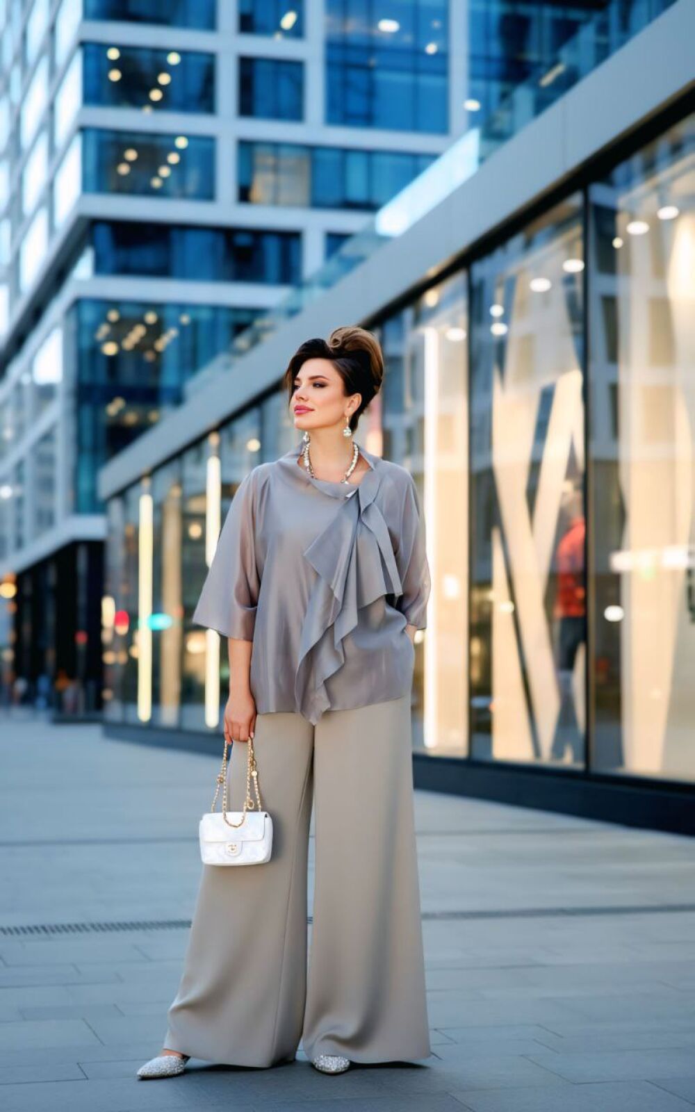 Элегантный брючный костюм, выполненный в мерцающем оттенке, который идеально подходит для создания утонченных образов. Комплект состоит из свободной блузы широких брюк палаццо, обеспечивая непревзойденный комфорт и легкость движений. Блуза привлекает внимание своим асимметричным дизайном с драпировками и широким, ниспадающим воротником, который придает образу динамичность и изысканность. Блуза свободного силуэта, с двойными деталями переда и спинки. Головина округлой формы. Рукав в блузе реглан, длиной ¾, что добавляет силуэту легкости и воздушности. В боковых швах блузы разрезы. Брюки с высокой посадкой и струящимся кроем визуально удлиняют ноги, создавая безупречный и гармоничный ансамбль. Этот костюм идеально подходит как для торжественных мероприятий, так и для деловых встреч, подчеркивая ваш безупречный вкус и чувство стиля. Длина блузы по спинке 68 см. Длина рукава блузы 48 см (р 50-54), 49 см (р 56-60). Длина брюк по боковому шву 108см (р 50-56), 108,5 см (р 58-60).