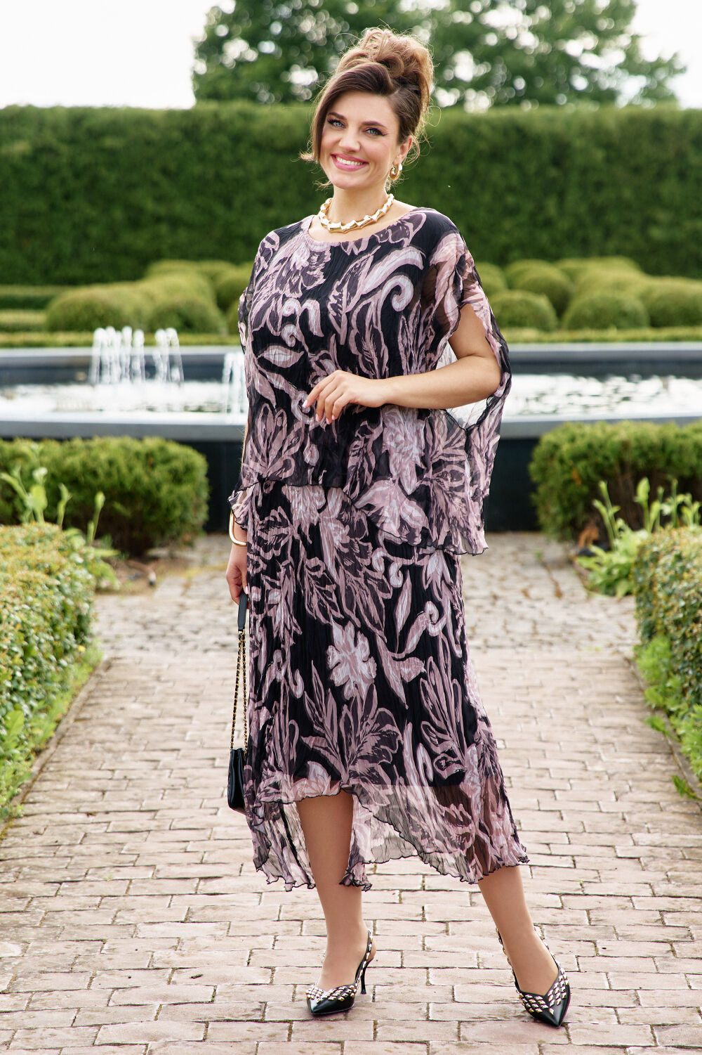 Платье изготовленно из легкой, полупрозрачной ткани с многослойной структурой, узор из стилизованных листьев и абстрактных элементов в приглушенных тонах черного, серого и лилового. Свободный крой с короткими рукавами обеспечивает максимальный комфорт и позволяет платью струиться по фигуре, деликатно подчеркивая ее достоинства. Асимметричный низ добавляет современности и легкости, создавая игривый силуэт. Верхняя часть платья отлетная на подкладке с цельнокроенным рукавом .Нижняя часть платья с расклешением, низ ассиметричный так же на подкладке.