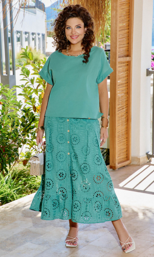 Рубашка— не просто верх, а главный акцент. Кожа, плотная, но податливая, образует «оверсайз» силуэт. Плечо, от места втачивания воротника и до вытачки по рукаву, украшены декоративными косичками из кожаных тесёмок. По переду рубашки застёжка на декоративные пуговицы в тон ткани по планке, и накладные карманы. Воротник рубашечного типа. Линия плеча спущенная. Спинка в рубашке с отрезной кокеткой. Рукав втачной, длинный с локтевым швом и разрезом от низа; заложенной складкой от низа и притачной манжетой. Низ в рубашке ассиметричный. Длина рубашки по спинке 81 см. Длина рукава рубашки 52 см.