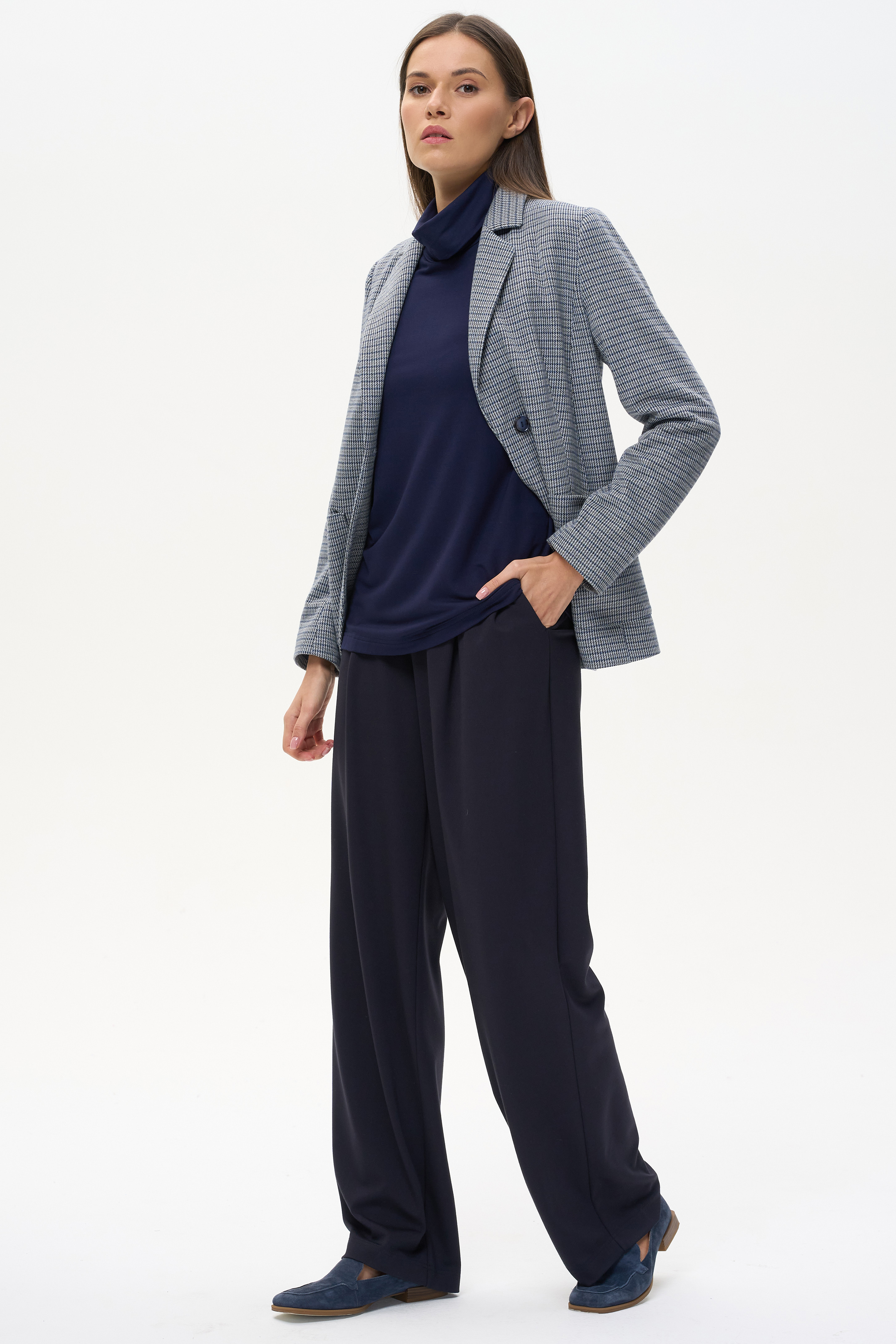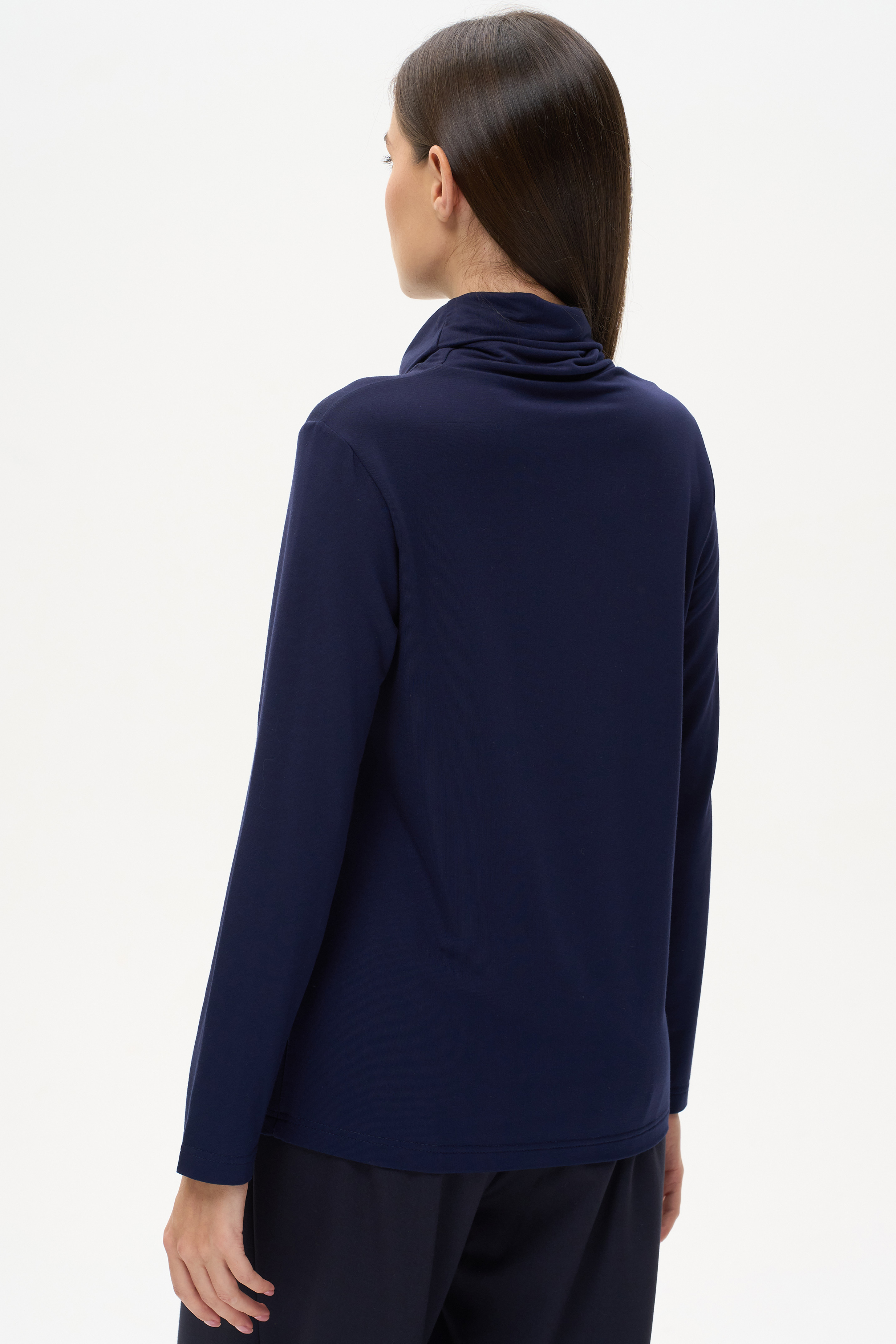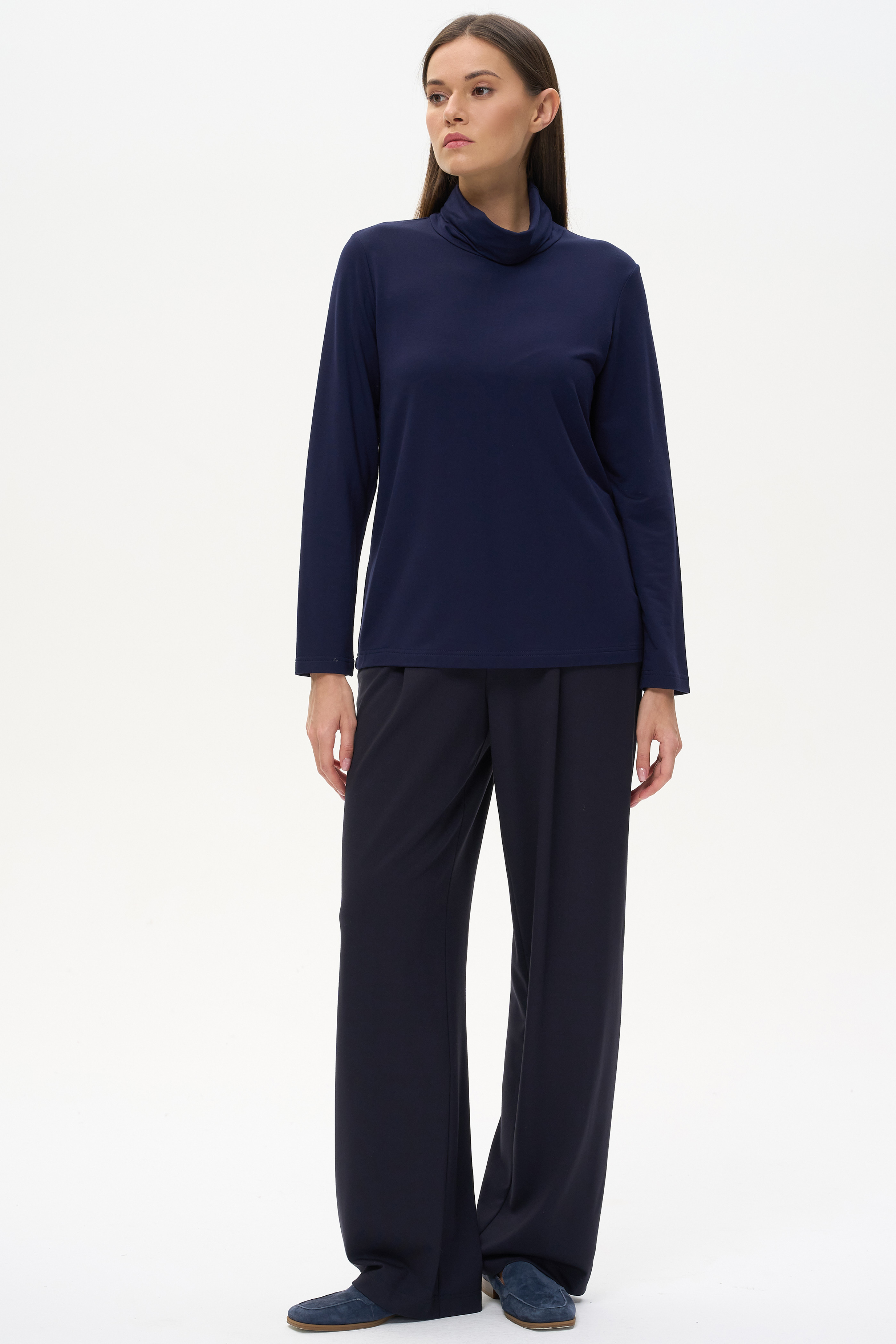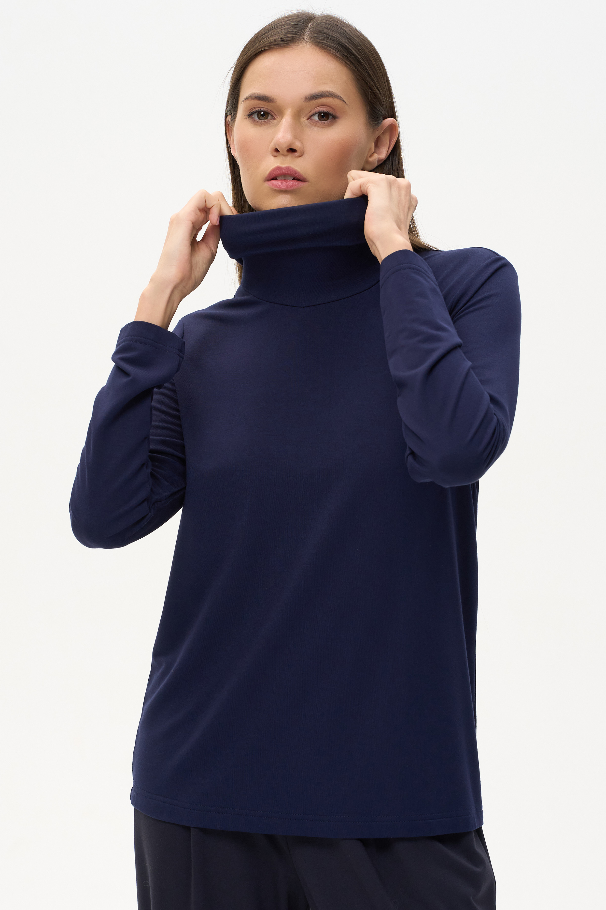 Комфортная водолазка из вискозного трикотажного полотна. Легкий воротник стойка, длинные втачные рукава. Рост модели на фото 178 cм.