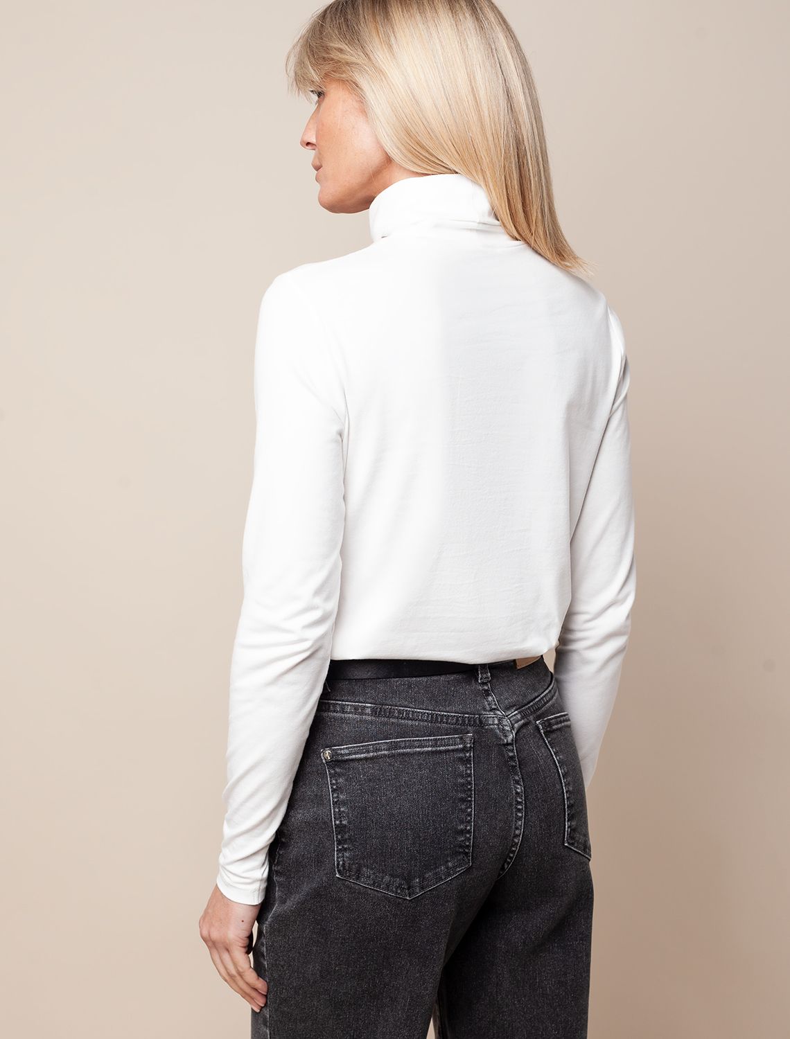 Базовая белая водолазка выполнена из премиального хлопка с добавлением эластичных волокон. Гладкий трикотаж обеспечит гарантированный комфорт и удобство в использовании. Внизу изделия металлическая нашивка с логотипом бренда. Совет стилиста: водолазка может заменить рубашку в нестрогом офисном образе или подружиться с джинсами-трубами, жилетом и кедами в расслабленном повседневном наряде. белый