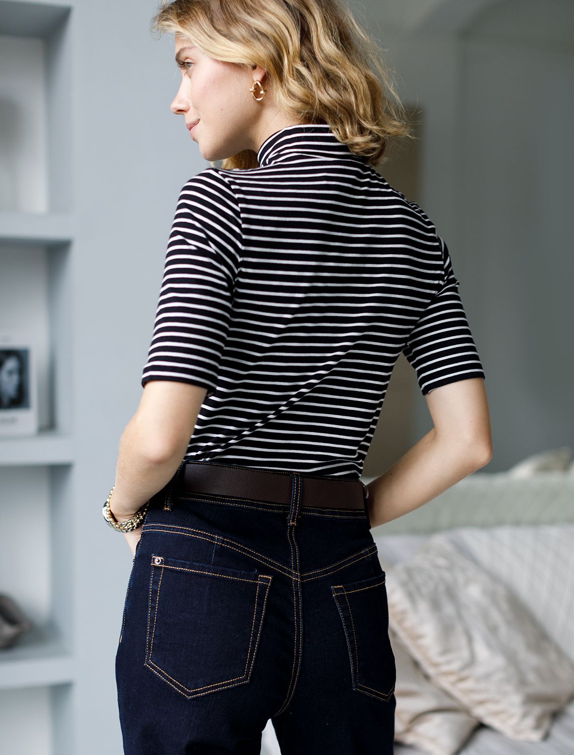 Водолазка с коротким рукавом выполнена из премиального хлопка с добавлением эластана. Гладкий трикотаж обеспечит гарантированный комфорт и удобство в использовании. Внизу изделия металлическая нашивка с логотипом бренда. Совет стилиста: водолазка может заменить рубашку в нестрогом офисном образе или подружиться с джинсами-трубами, жилетом и кедами в расслабленном повседневном наряде. черно-белая полоса