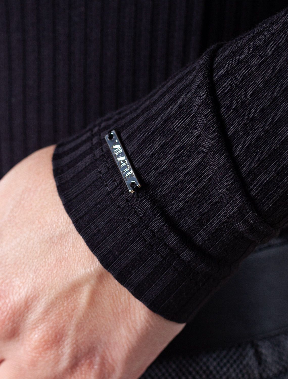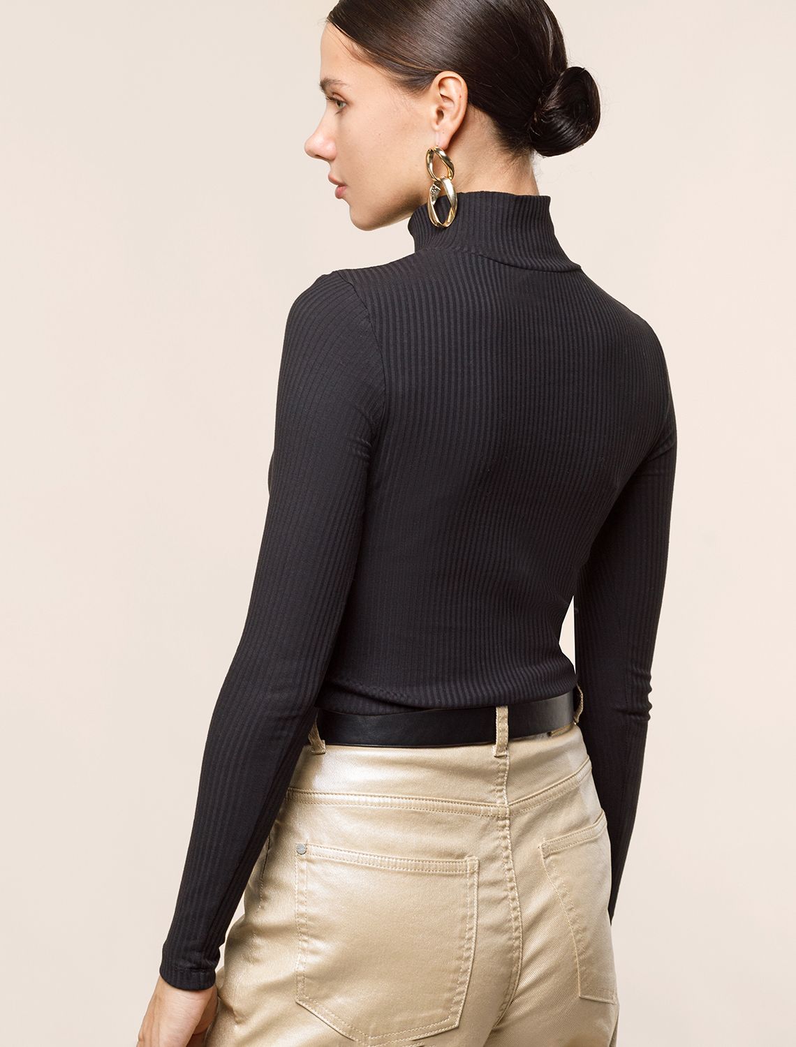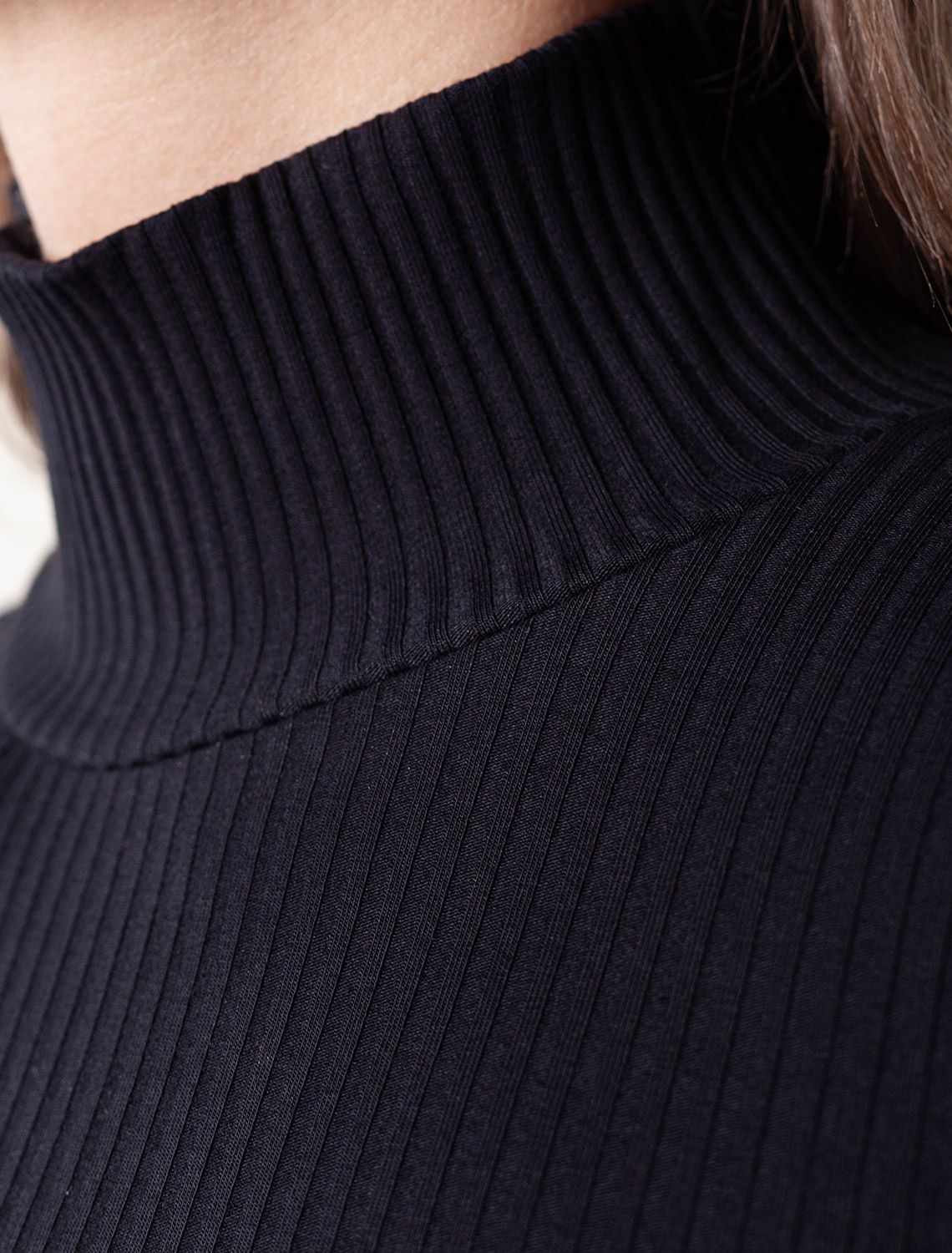 Водолазка выполнена из фактурного трикотажа в широкий рубчик. Модель с узким рукавом хорошо сидит по фигуре, подчеркивая достоинства. Полотно слаборастяжимое, рекомендуем брать изделие четко в соответствии с размером, а кто любит чуть свободнее — то на размер больше. Хлопковый трикотаж поддерживает оптимальную температуру тела, поэтому в изделии будет комфортно в течении всего дня. Наличие эластана в составе гарантирует формоустойчивости. Водолазка отлично впишется в деловой дресс-код и подойдет для повседневного аутфита. черный