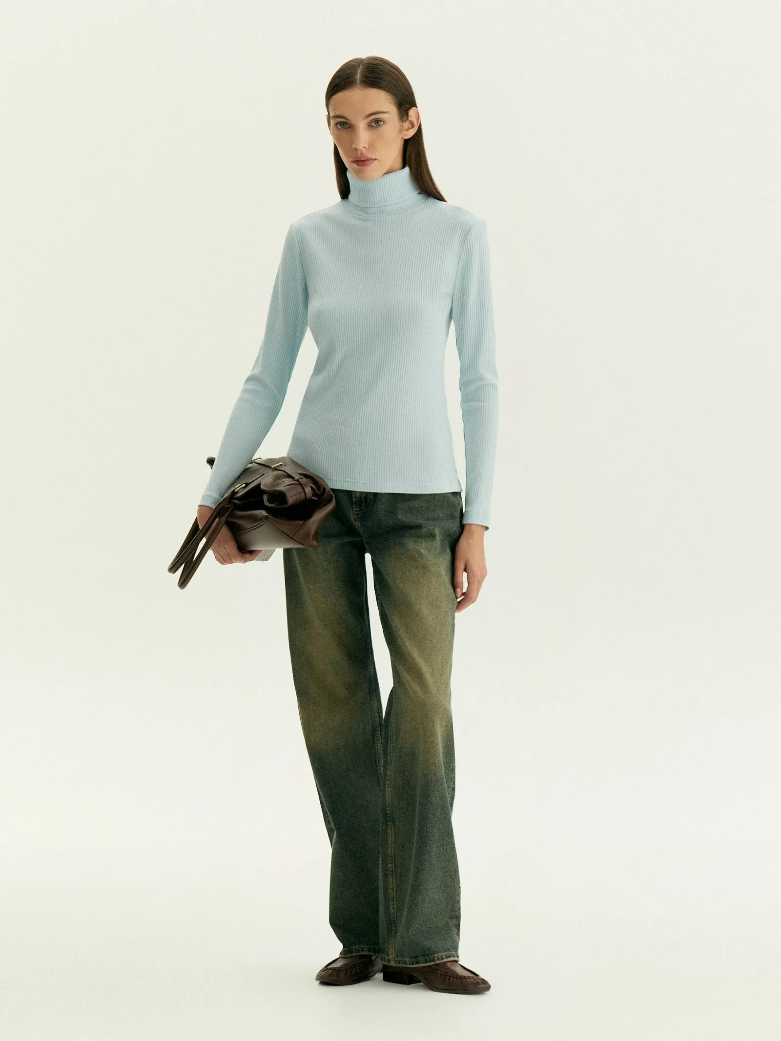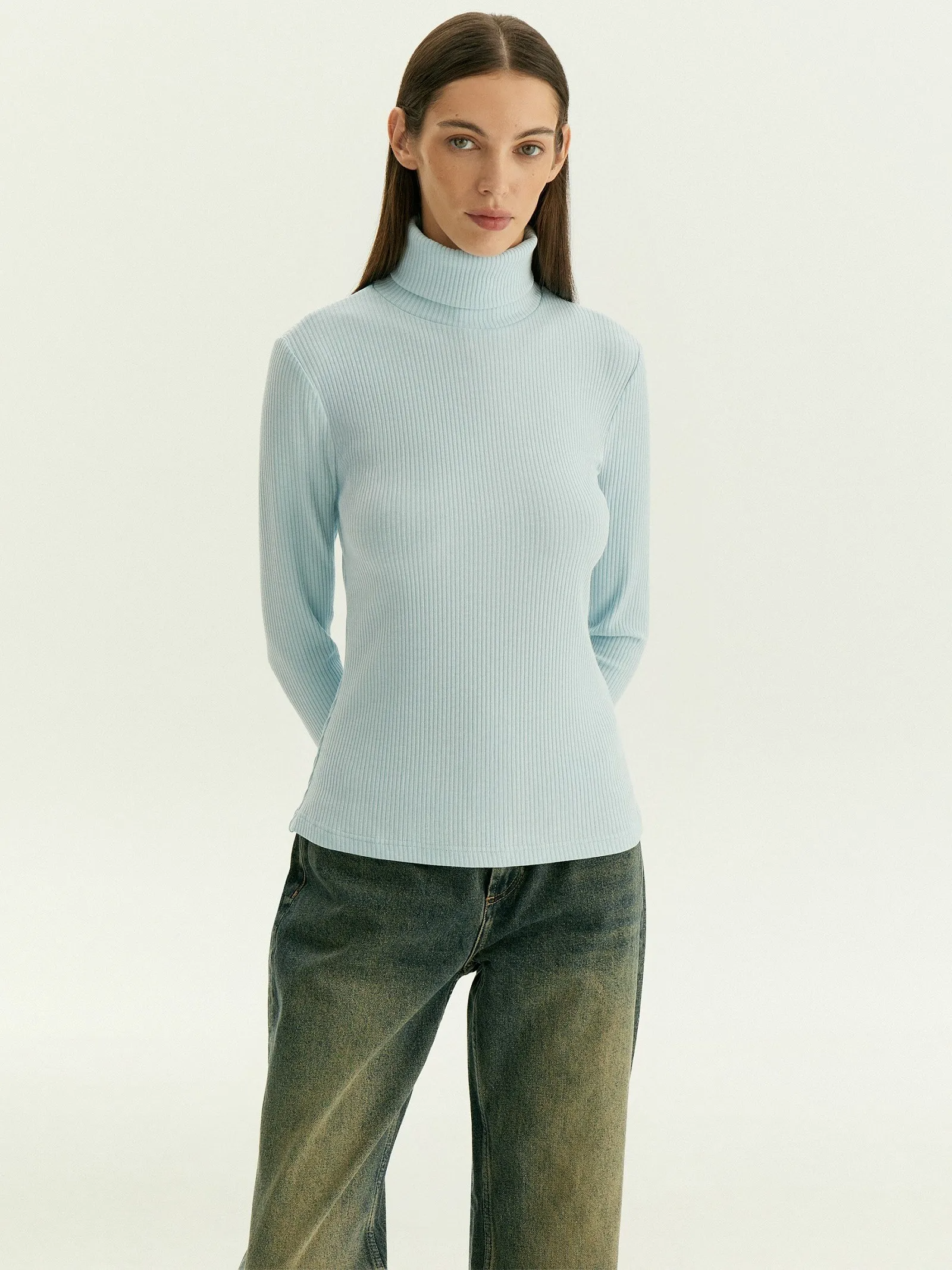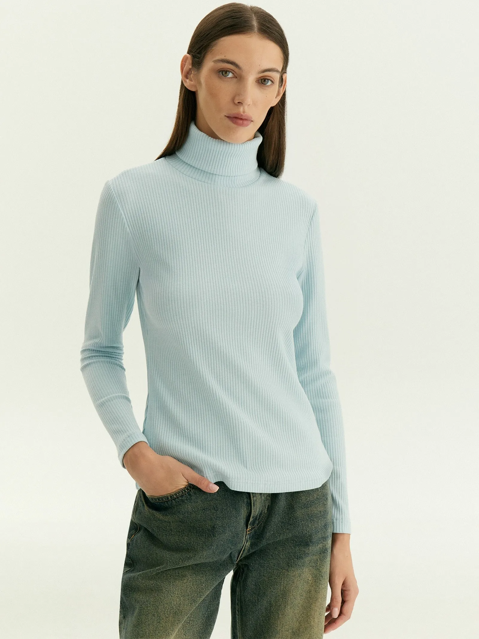 Голубая базовая водолазка в рубчик станет основой множества повседневных образов.