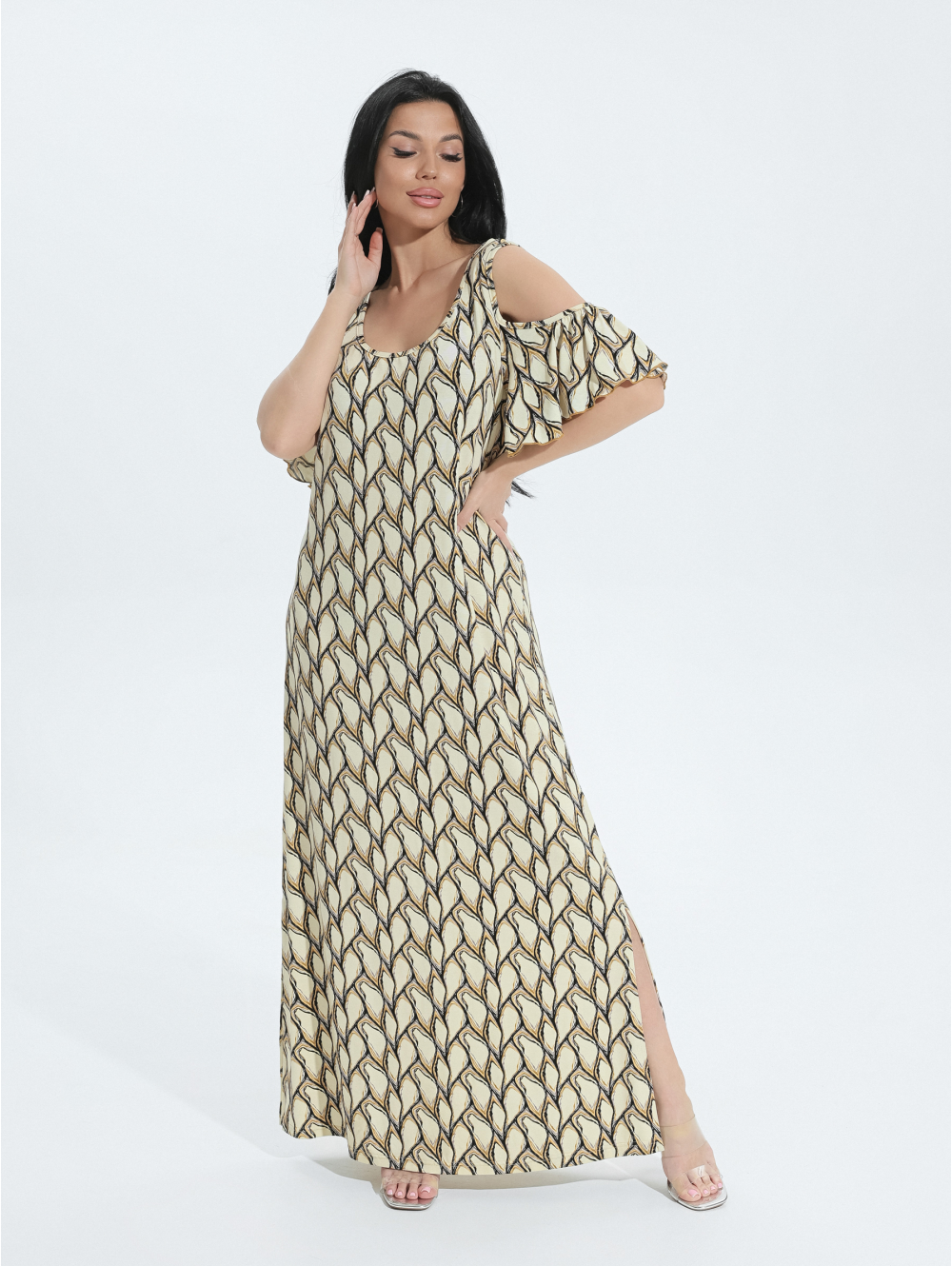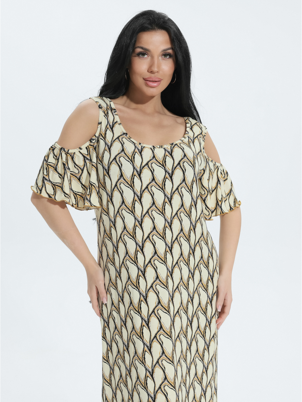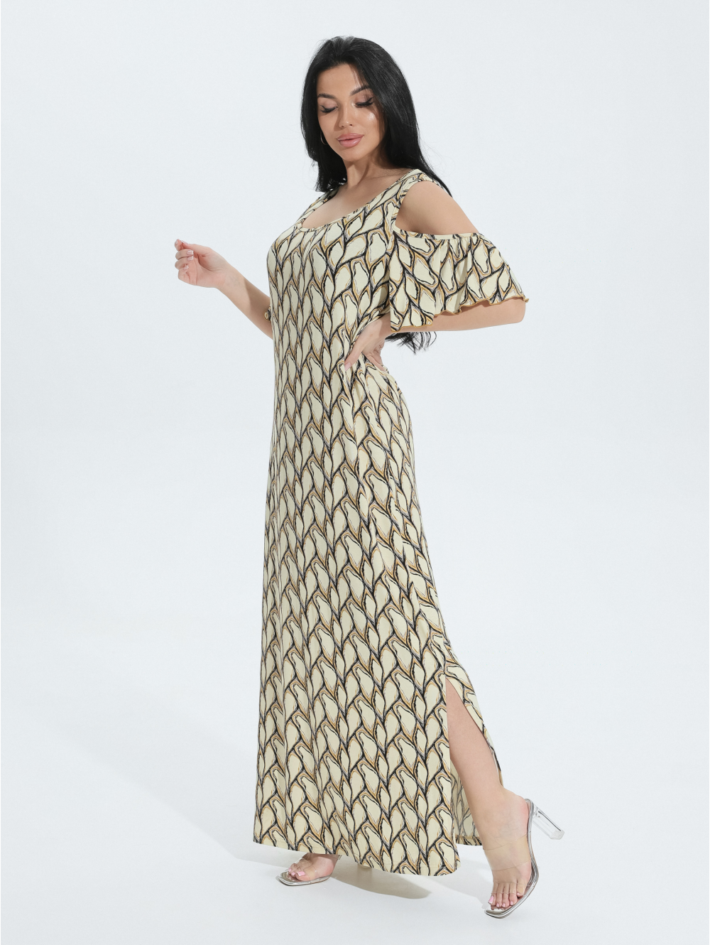 В длинном вискозном платье легко скрыть недостатки фигуры, материал изделия мягко струится, не мнется, охлаждает в летнюю жару.