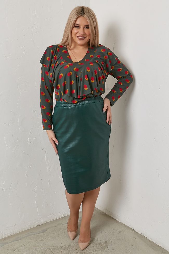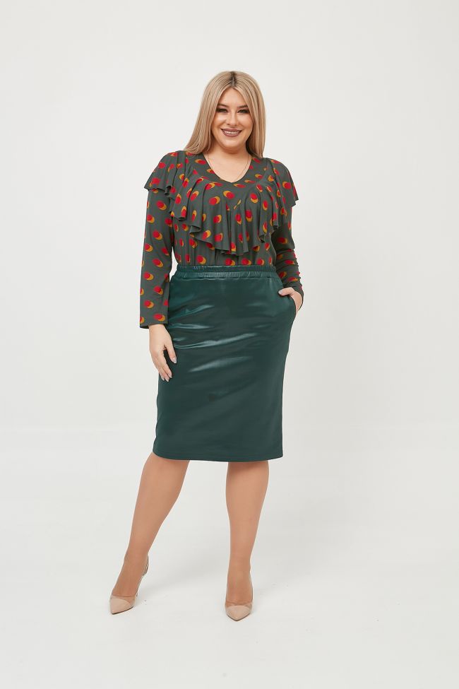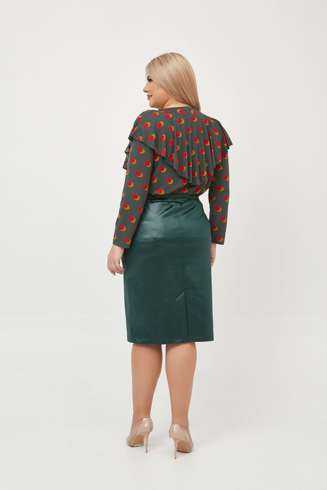 зеленый Классическая юбка из однотонного трикотажа "кожа "длиной за линию колен. Перед с прорезными карманами с листочкой. В среднем шве заднего полотнища - шлица. Пояс на резинке. Низ ровный. Отличный вариант для создания стильного образа.