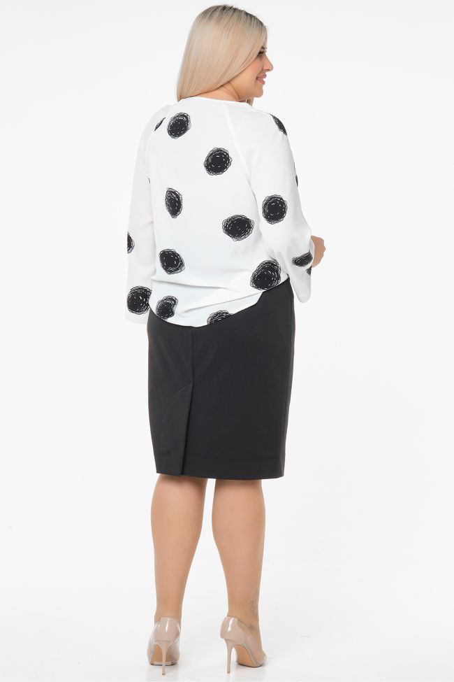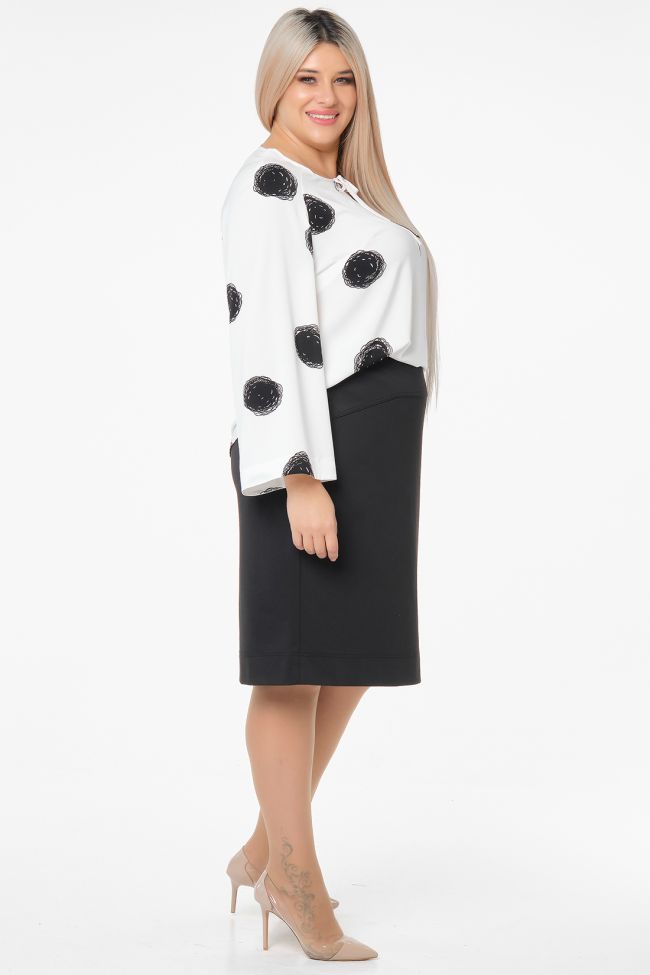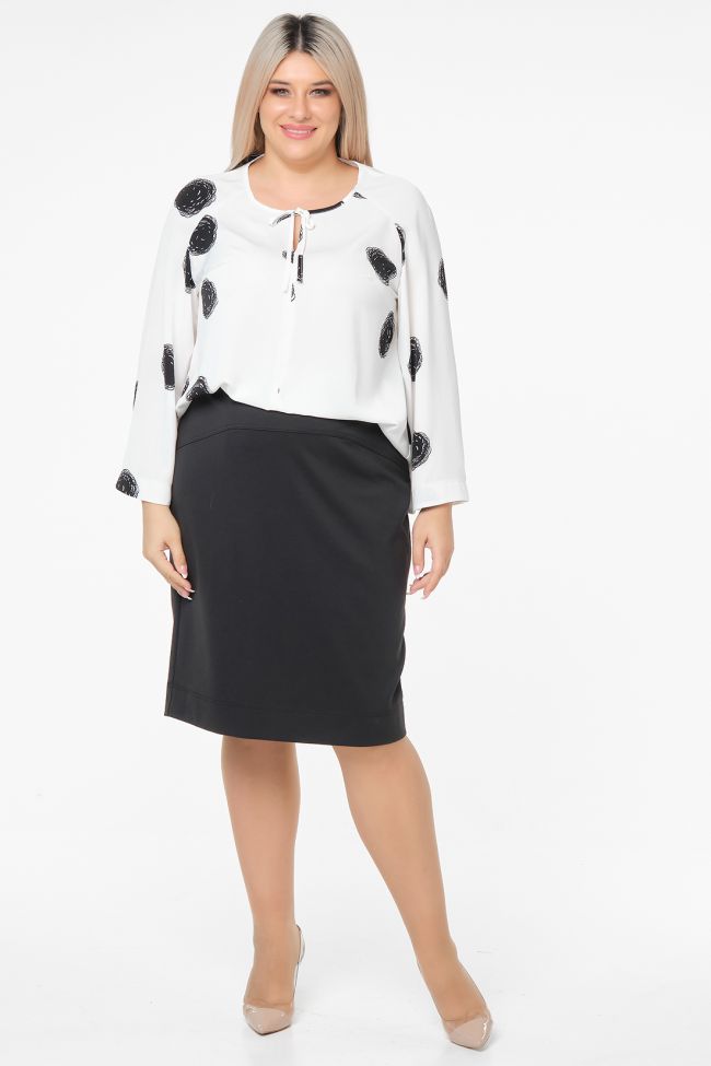 черный Классическая юбка из однотонного трикотажа "джерси", на подкладке. Перед с фигурной кокеткой. В среднем шве заднего полотнища тесьма - молния и шлица. Пояс комбинированный, с застежкой на петлю и пуговицу. Низ ровный.