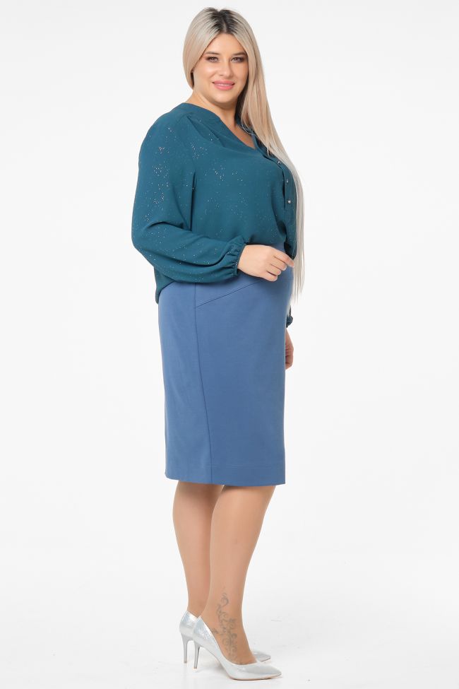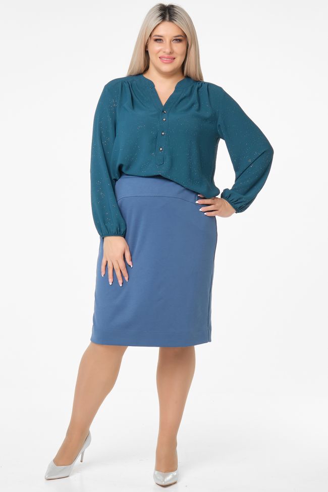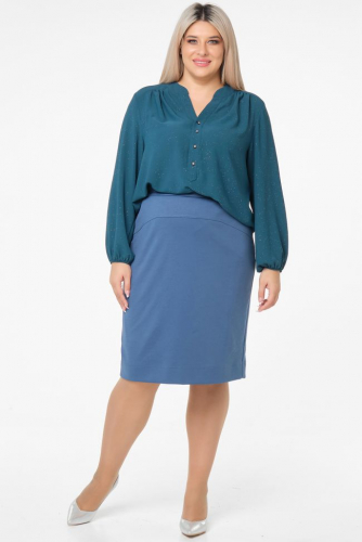 голубой Классическая юбка из однотонного трикотажа "джерси", на подкладке. Перед с фигурной кокеткой. В среднем шве заднего полотнища тесьма - молния и шлица. Пояс комбинированный, с застежкой на петлю и пуговицу. Низ ровный.