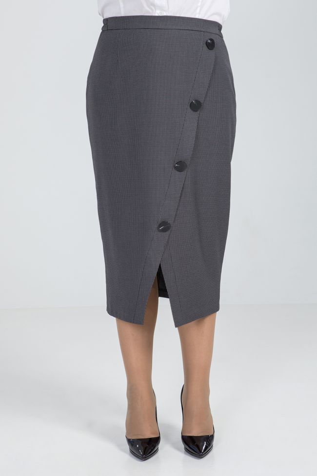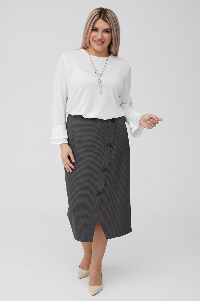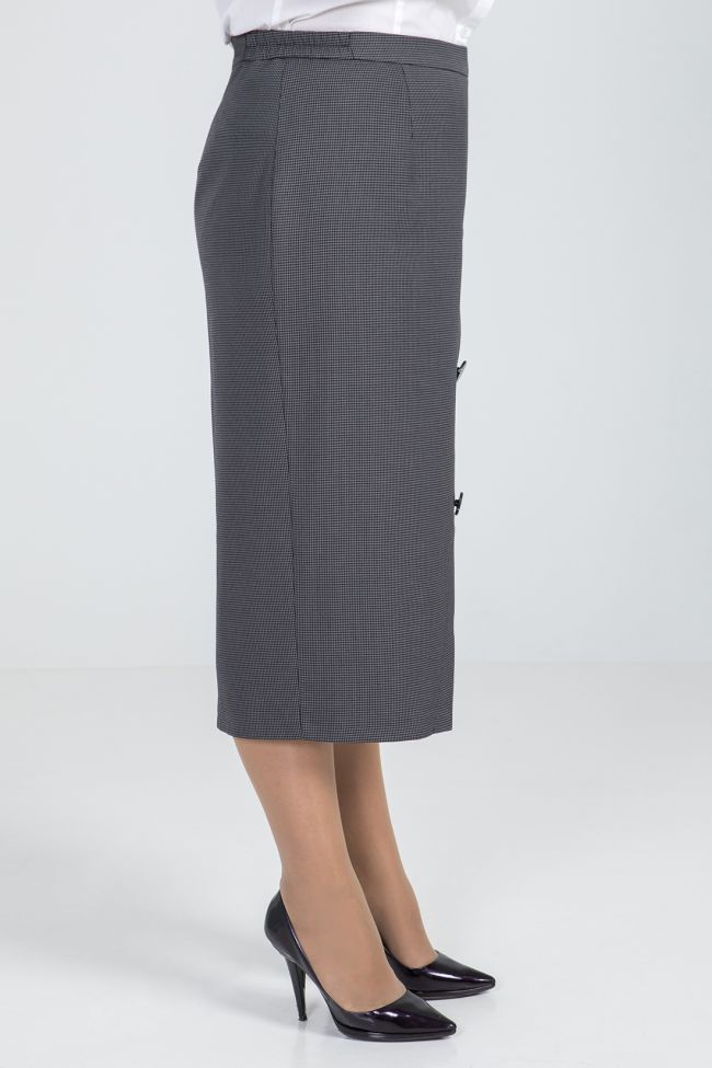 серый Классическая юбка длиной за колено из костюмной ткани, на подкладе. По переду диагональный подрез, дополнен крупными пуговицами. В среднем шве заднего полотнища - тесьма - молния и шлица. Пояс комбинированный, с застежкой на петлю и пуговицу.