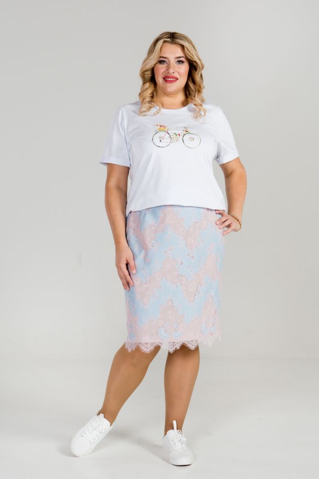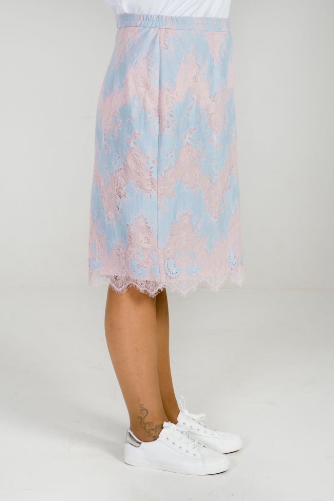 голубой Классическая юбка на трикотажном подкладе из кружевного полотна с фестонами. В среднем шве заднего полотнища тесьма - молния и шлица. Пояс комбинированный, с эластичной тесьмой по боковым швам.