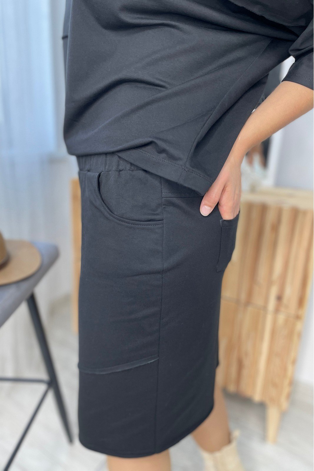 "Юбка женская прямого силуэта из трикотажной ткани.По переду расположены карманы с настрочными швами с открытыми срезами. Задняя половинка юбки со средним швом ,заканчивающимся разрезом,какеткой и накладными карманами. Верх юбки оформлен поясом ,в пояс вставлена резинка.