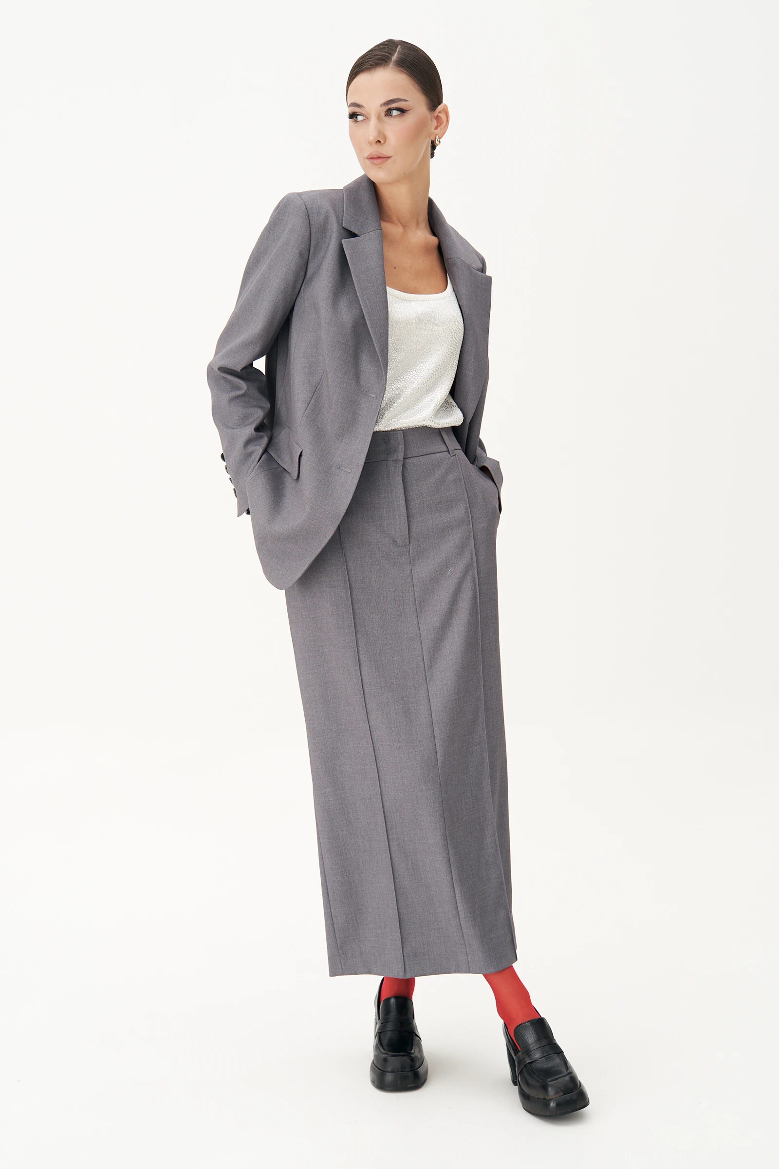 Юбка прямая, макси, на притачном поясе со шлёвками. Застёжка на брючные потайные крючки и молнию по центру переднего полотнища юбки. Также по переду юбки две складки - защипа и наклонные боковые карманы. Заднее полотнище юбки с центральным швом и шлицей, вытачками и прорезными карманами с листочками.Длина юбки около 90 см.