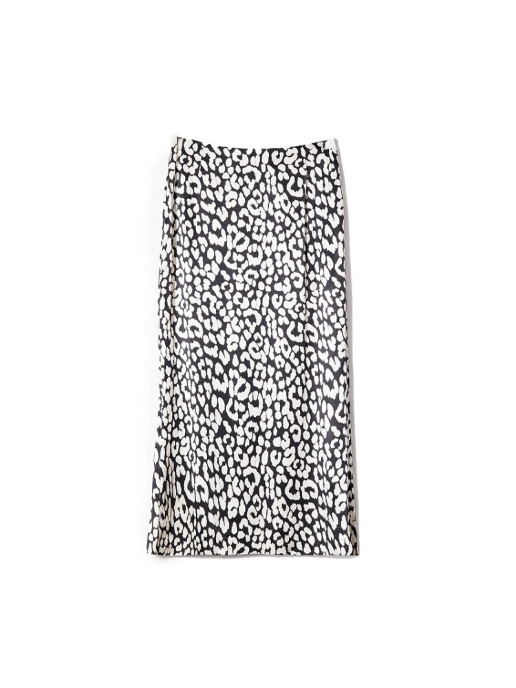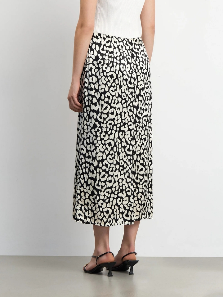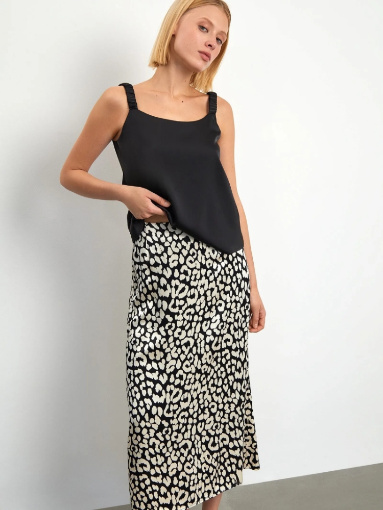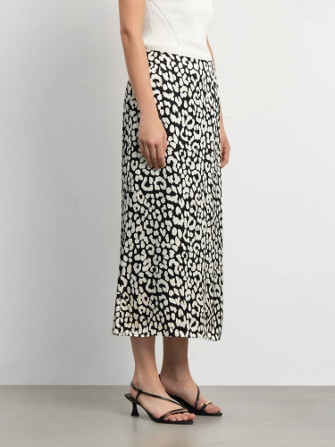 Чёрная юбка с анималистическим принтом. Модель А-силуэта в длине миди имеет высокую посадку. Застёгивается на молнию сзади. Юбка подойдёт для создания модных повседневных образов. Дополнить её можно трикотажным или атласным топом и другими элементами базового гардероба. Изделие выполнено из вискозы, на вискозной подкладке