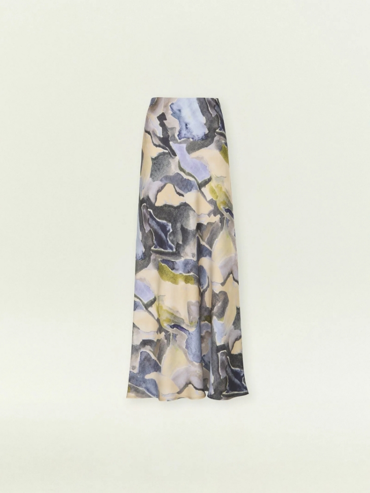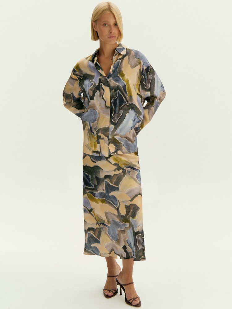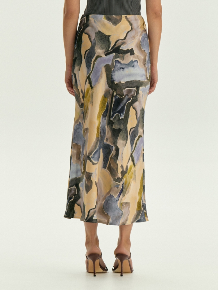 Юбка с модным "минеральным" принтом в актуальных оттенках сезона: он напоминает аметист, желтый и зелёный мрамор. Принт позволяет комбинировать юбку с верхом фиолетового, жёлтого, зелёного, серого, молочного цветов. Завершить образ можно блузой из комплекта, шёлковым топом, простой белой рубашкой или другим вариантом верха.Модель А-силуэта в длине миди имеет высокую посадку. Скроена по косой, чтобы обеспечить красивую посадку по фигуре. Застёгивается на молнию сбоку. Юбка сделана из шелковистой вискозы, без подкладки