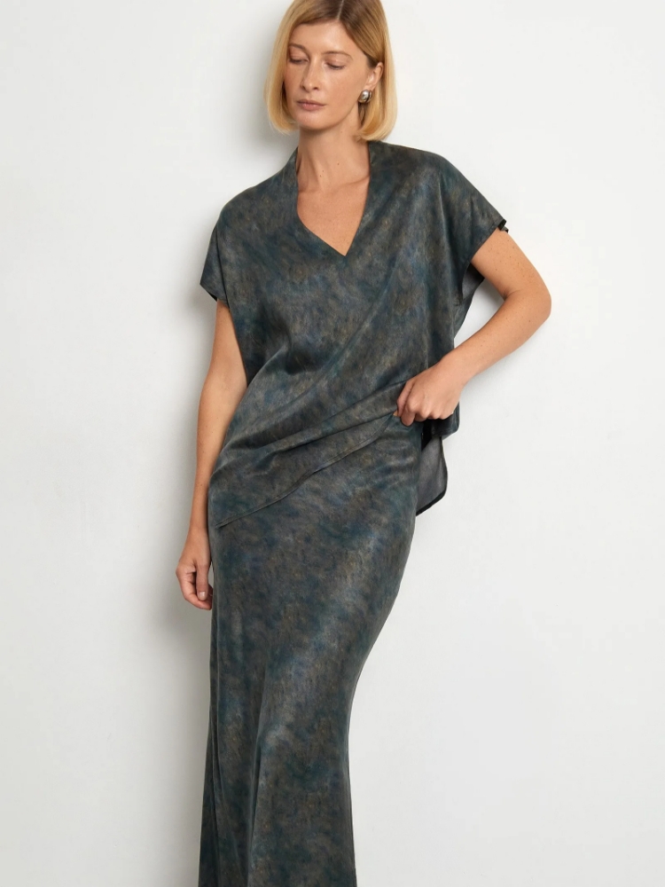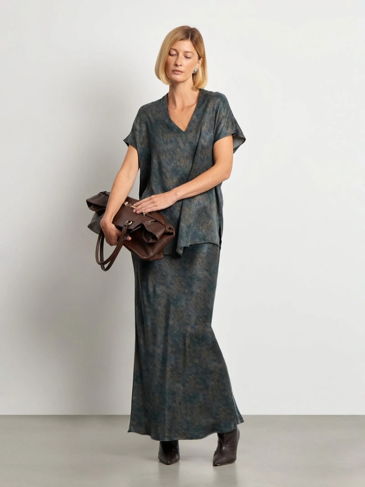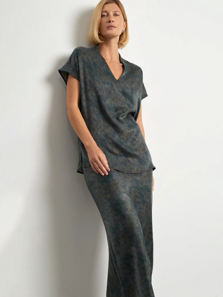 Юбка, которая подойдёт на особый случай и на каждый день. Её главное достоинство — шелковистый, очень приятный на ощупь материал из купры и вискозы. Необычная расцветка напоминает о глубине мощного речного потока. Материал и цвет создают очень женственный образ, притягательный за счёт спокойствия и глубины. Универсальная модель А-силуэта в длине миди имеет высокую посадку. Застёгивается на молнию сбоку на удобную молнию