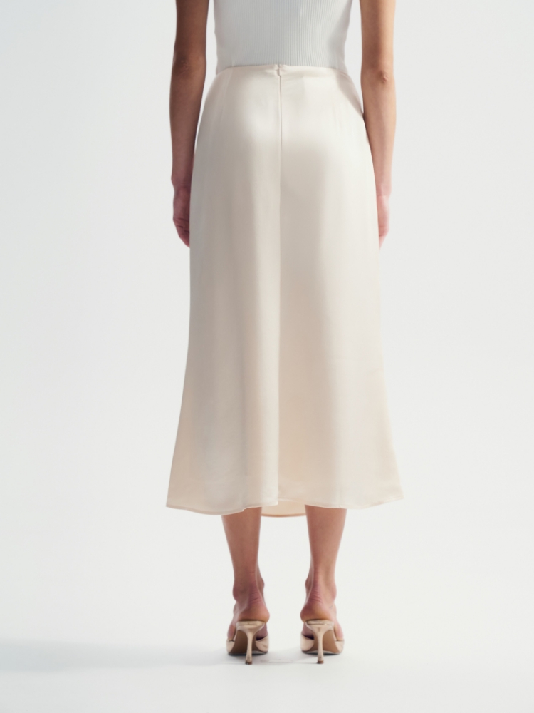 Юбка для роскошных образов под настроение. Атлас нежного сливочного оттенка делает образ особенно элегантным.Модель А-силуэта в длине миди имеет высокую посадку. Застёгивается на молнию сзади. Дополнить юбку можно топом из комплекта или шелковым топом с кружевом на тонких бретелях. Изделие выполнено на приятной к телу вискозной подкладке