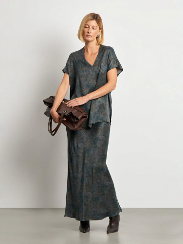 Юбка, которая подойдёт на особый случай и на каждый день. Её главное достоинство — шелковистый, очень приятный на ощупь материал из купры и вискозы. Необычная расцветка напоминает о глубине мощного речного потока. Материал и цвет создают очень женственный образ, притягательный за счёт спокойствия и глубины. Универсальная модель А-силуэта в длине миди имеет высокую посадку. Застёгивается на молнию сбоку на удобную молнию.