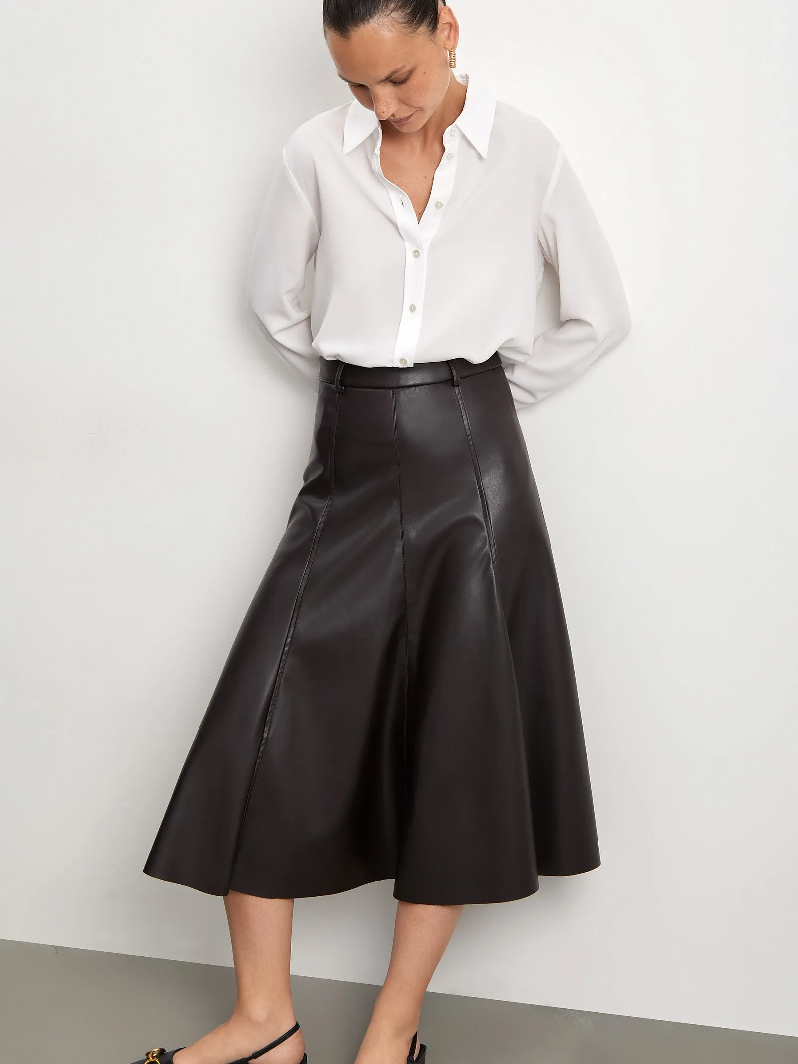 Юбка-полусолнце из экокожи для эффектных образов в трендах сезона. Модель А-силуэта имеет высокую посадку и длину миди. Дополнена шлёвками для ремня. Застёгивается на молнию. Юбка будет сочетаться с блузками или рубашками офисного стиля, боди или рубашкой из эко-кожи.