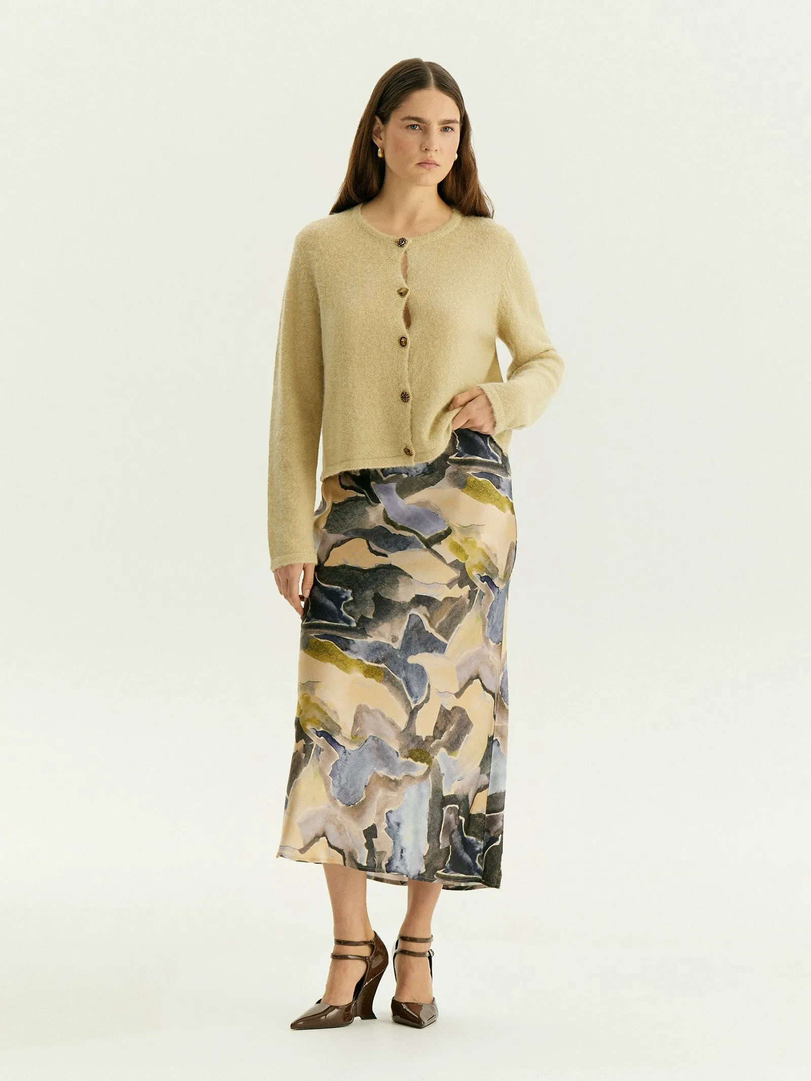Юбка с модным "минеральным" принтом в актуальных оттенках сезона: он напоминает аметист, желтый и зелёный мрамор.