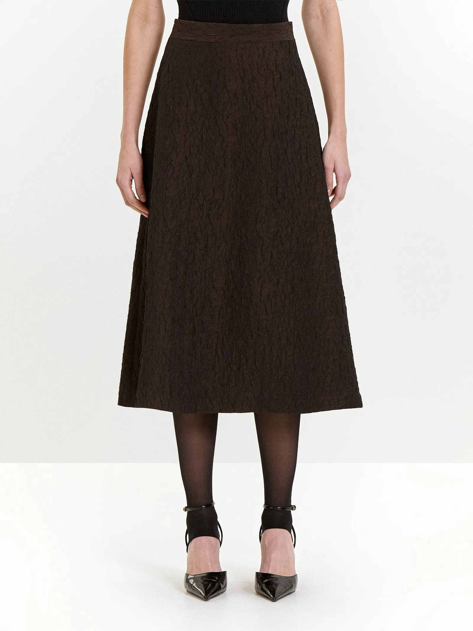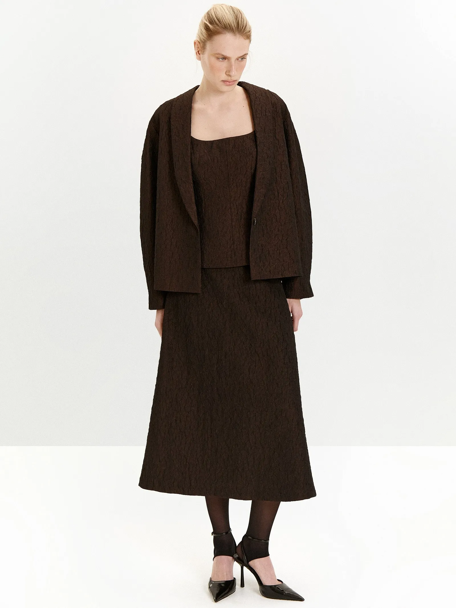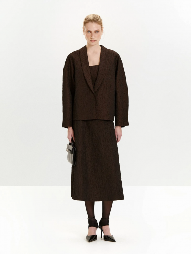 Тафта с краш-эффектом в глубоком цвете шоколада — новое в нашей коллекции. Этот выбор отражает свежие тренды с подиумов и заземляющий фокус на телесные ощущения.