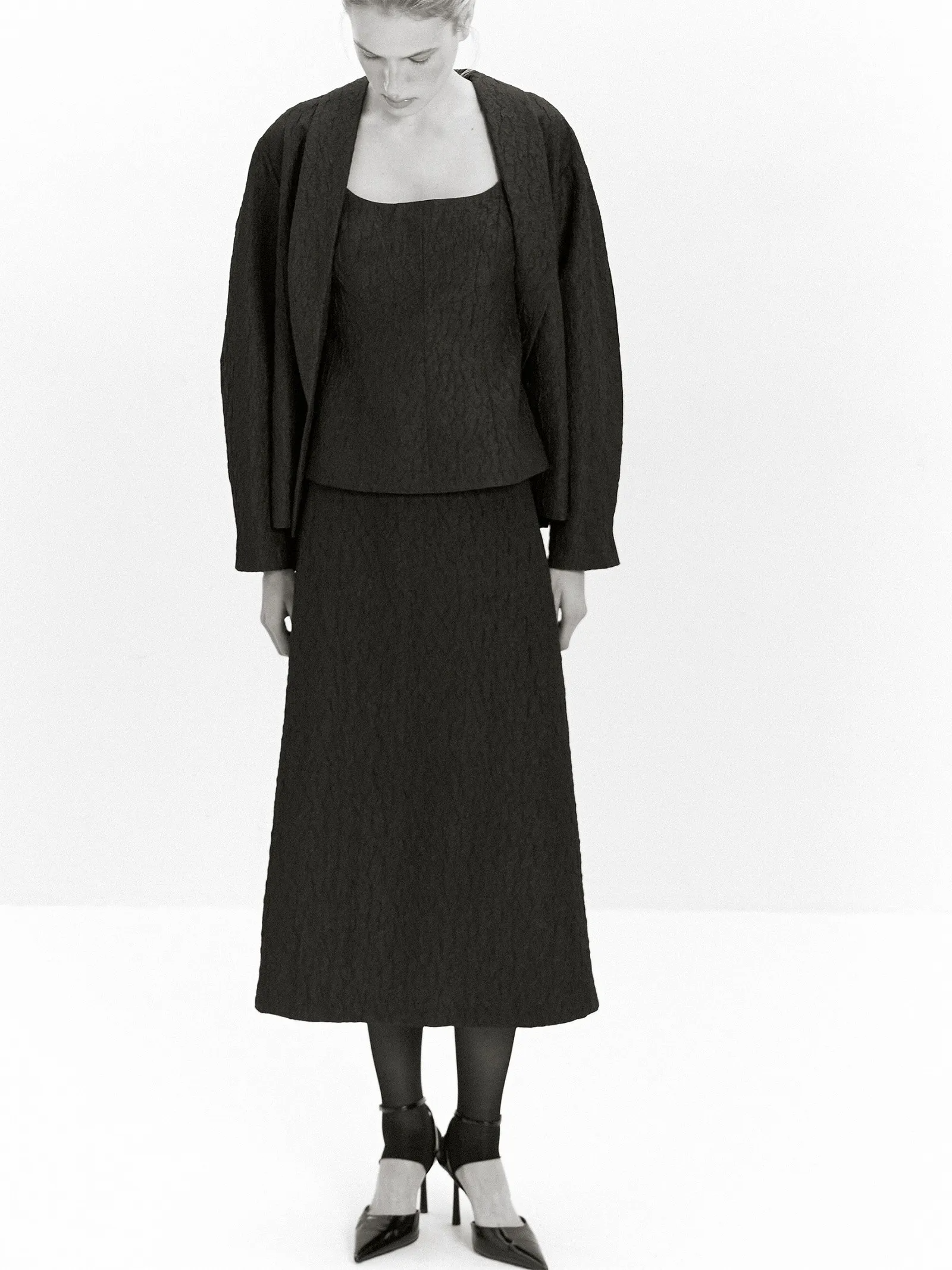 Собрать образ можно с силуэтным топом и объемным жакетом из комплекта или другими вариантами верха по вкусу.