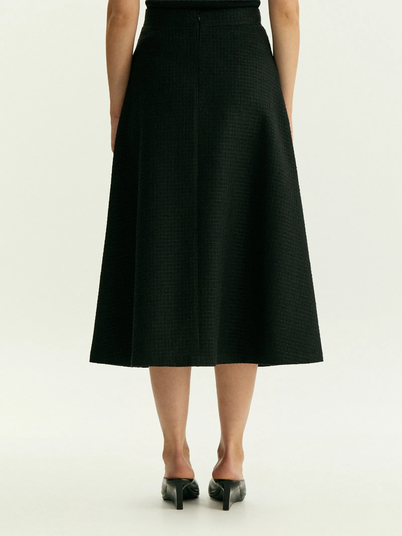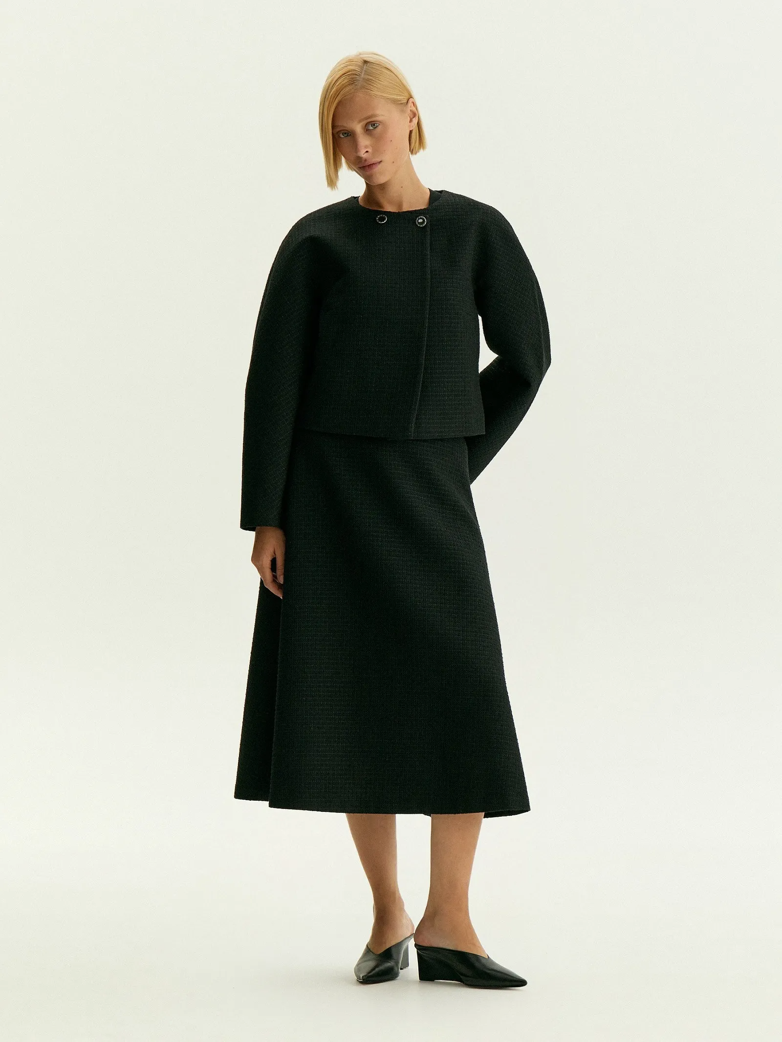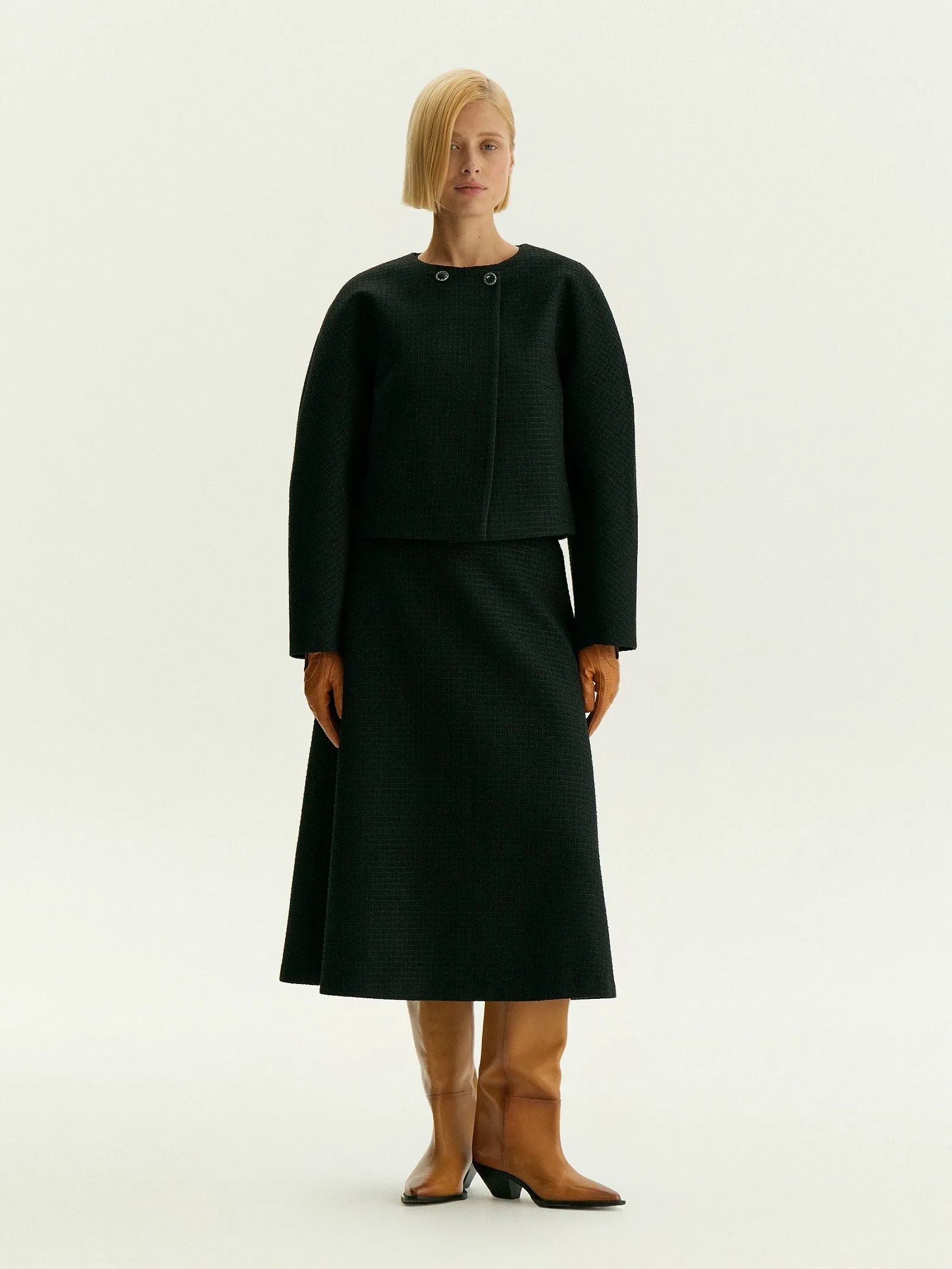 Чёрная юбка из твида станет универсальным вариантом для образов на выход и на работу. Завершить можно жакетами из комплекта или другим вариантом верха.