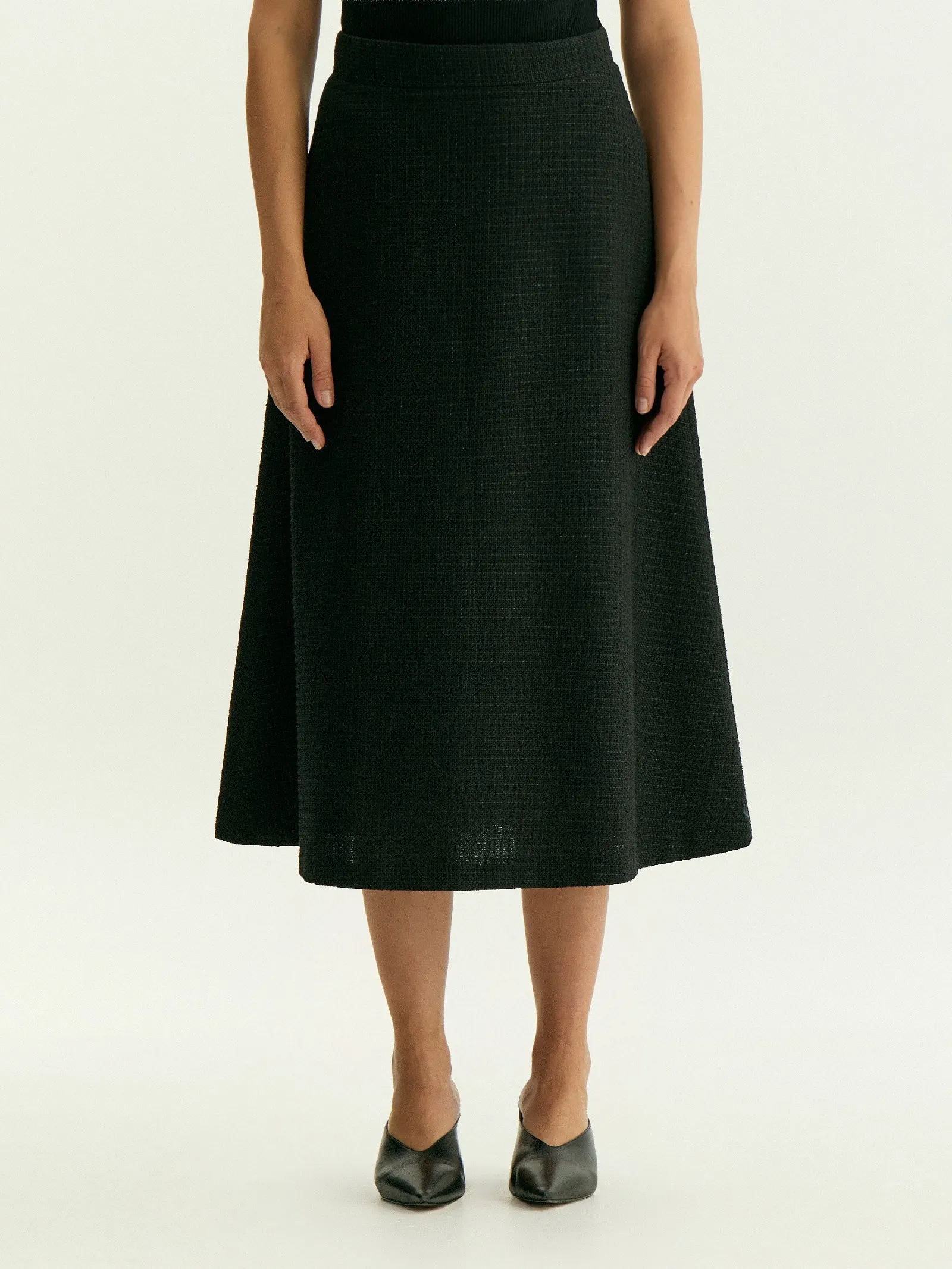 Юбка выполнена из материала с содержанием хлопка, на подкладке c вискозой. На чёрном фоне фактурного, тактильно интересного материала заманчиво поблёскивает чёрный люрекс.