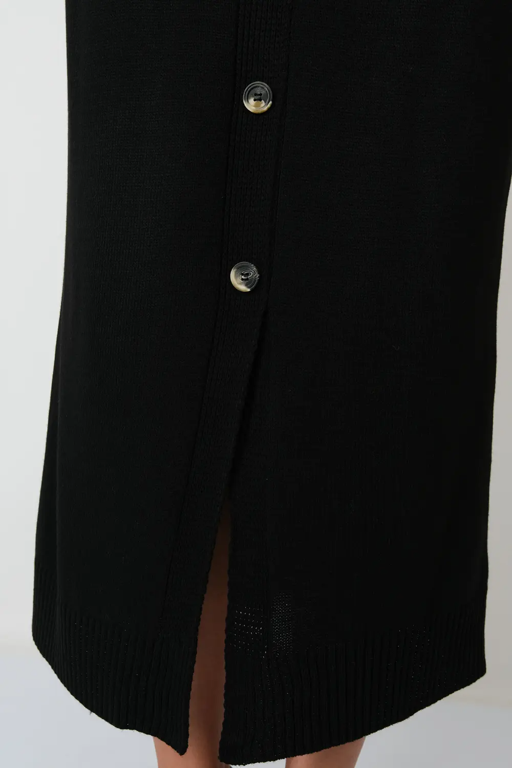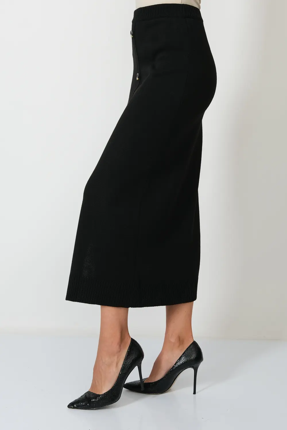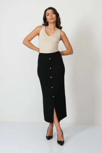 Юбка прямого силуэта  с разрезом спереди и имитацией застежки на пуговицы, в пояс юбки горизонтально проложена эластичная резинка. черный