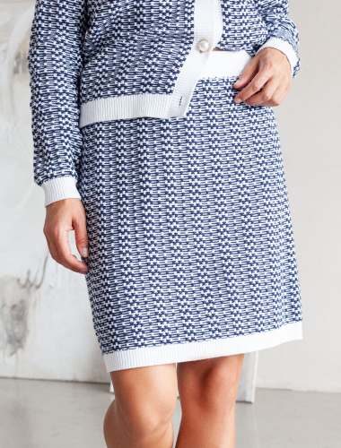 Юбка фактурной вязки выполнена из мягкой хлопковой пряжи с добавлением акрила. Изделие дополнено трикотажной подкладкой, в поясе вставлена эластичная резинка, что гарантирует абсолютный комфорт при носке. Сочетайте в костюме с жакетом D31.387 чтобы получить завершённый элегантный образ.