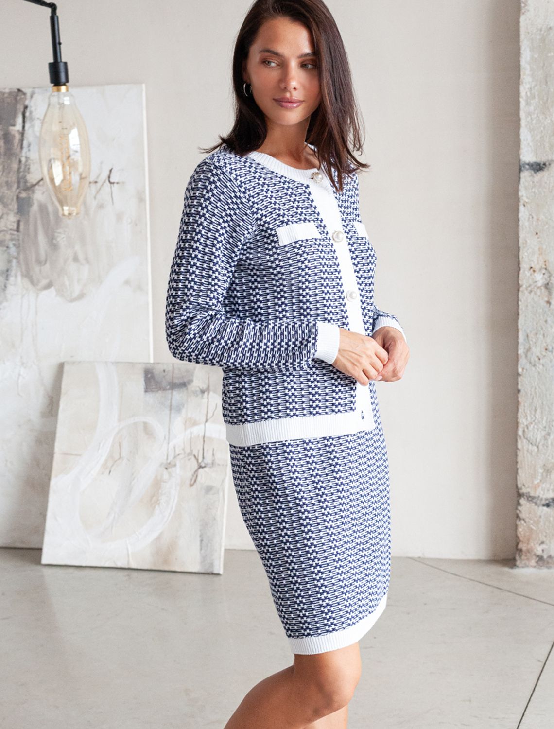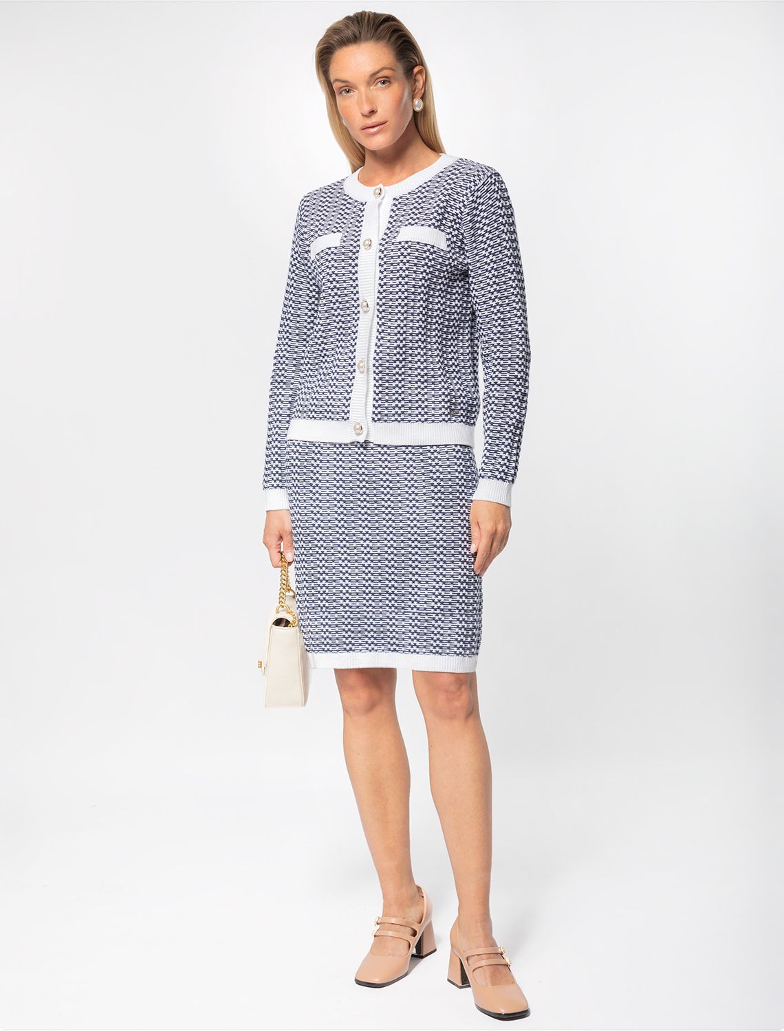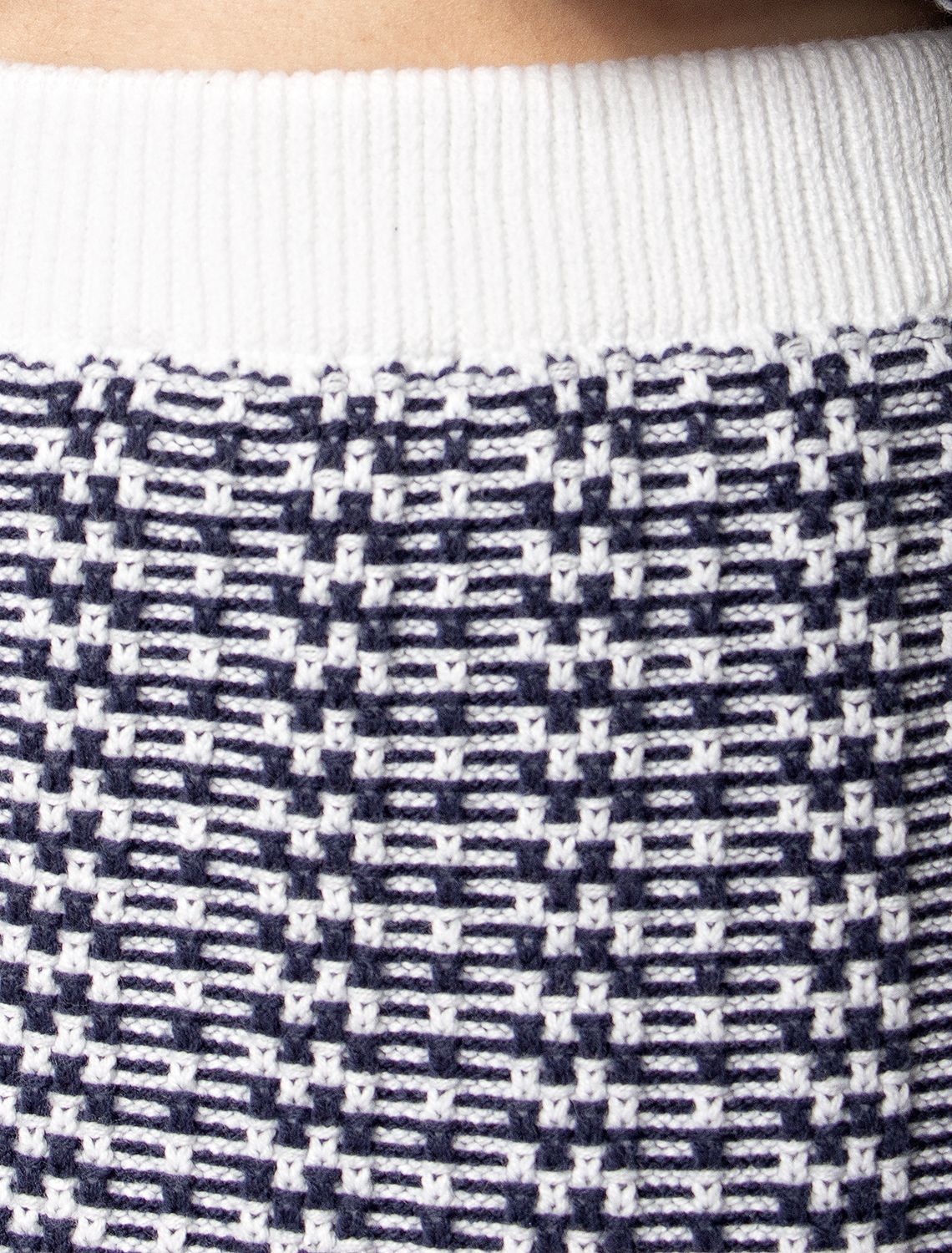 Юбка фактурной вязки выполнена из мягкой хлопковой пряжи с добавлением акрила. Изделие дополнено трикотажной подкладкой, в поясе вставлена эластичная резинка, что гарантирует абсолютный комфорт при носке. Сочетайте в костюме с жакетом D31.387 чтобы получить завершённый элегантный образ. т.синий_нат.белый