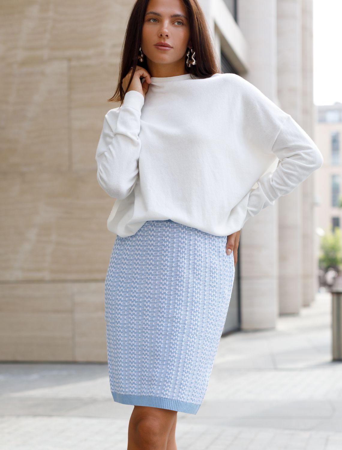 Юбка фактурной вязки выполнена из мягкой хлопковой пряжи с добавлением акрила. Изделие дополнено трикотажной подкладкой, в поясе вставлена эластичная резинка, что гарантирует абсолютный комфорт при носке. Сочетайте в костюме с жакетом D31.387 чтобы получить завершённый элегантный образ. голубой
