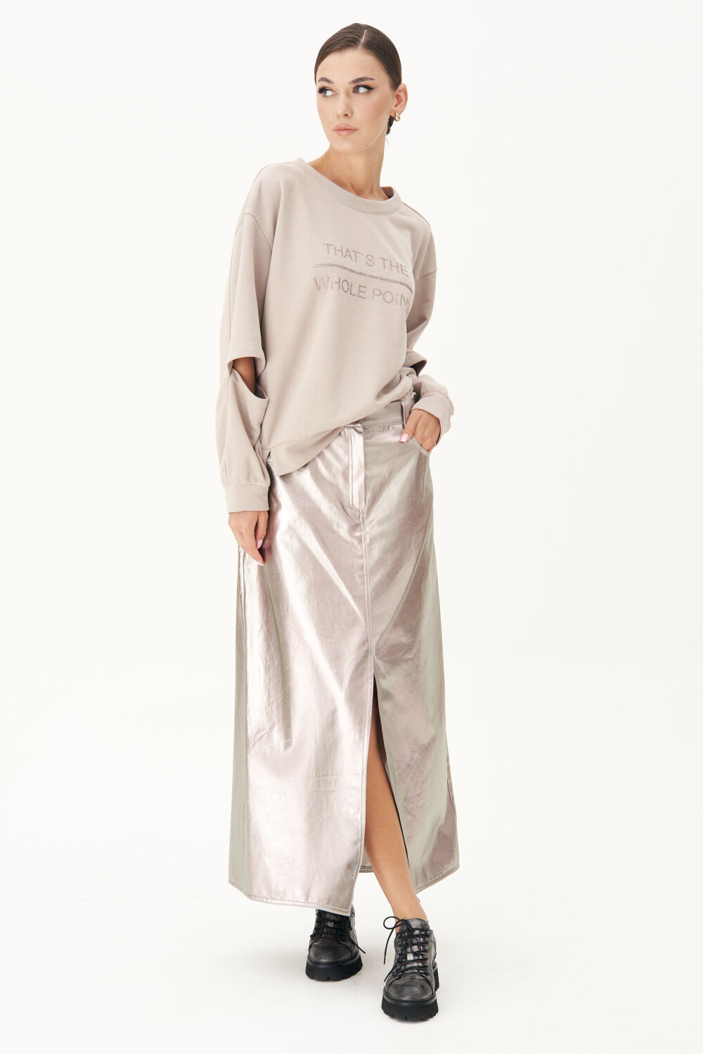 Юбка А-силуэта на притачном поясе со шлёвками. Переднее полотнище юбки с центральным швом, застёжкой в нём на молнию и пуговицу, эффектным разрезом и боковыми фигурными карманами.