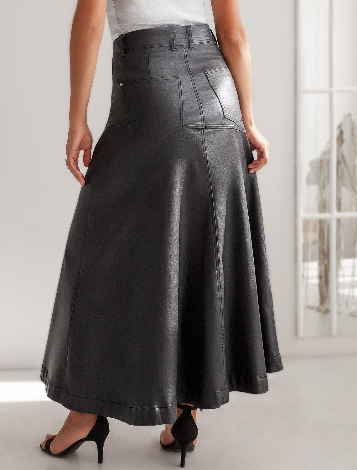 Пышная юбка-полусолнце кроеная по косой выполнена из эластичного хлопка с металлизированным покрытием под кожу. Изделие дополнено кокеткой и пятью карманами как у джинсов. Материал отталкивает влагу и за счет большого содержания хлопка, изделие поддерживает оптимальный микроклимат. Внутренняя тканевая сторона мягкая и очень комфортная к телу. Трендовая модель с мягким сияющим эффектом будет сочетаться с любым верхом и впишется не только в праздничный образ, но и в повседневный гардероб.