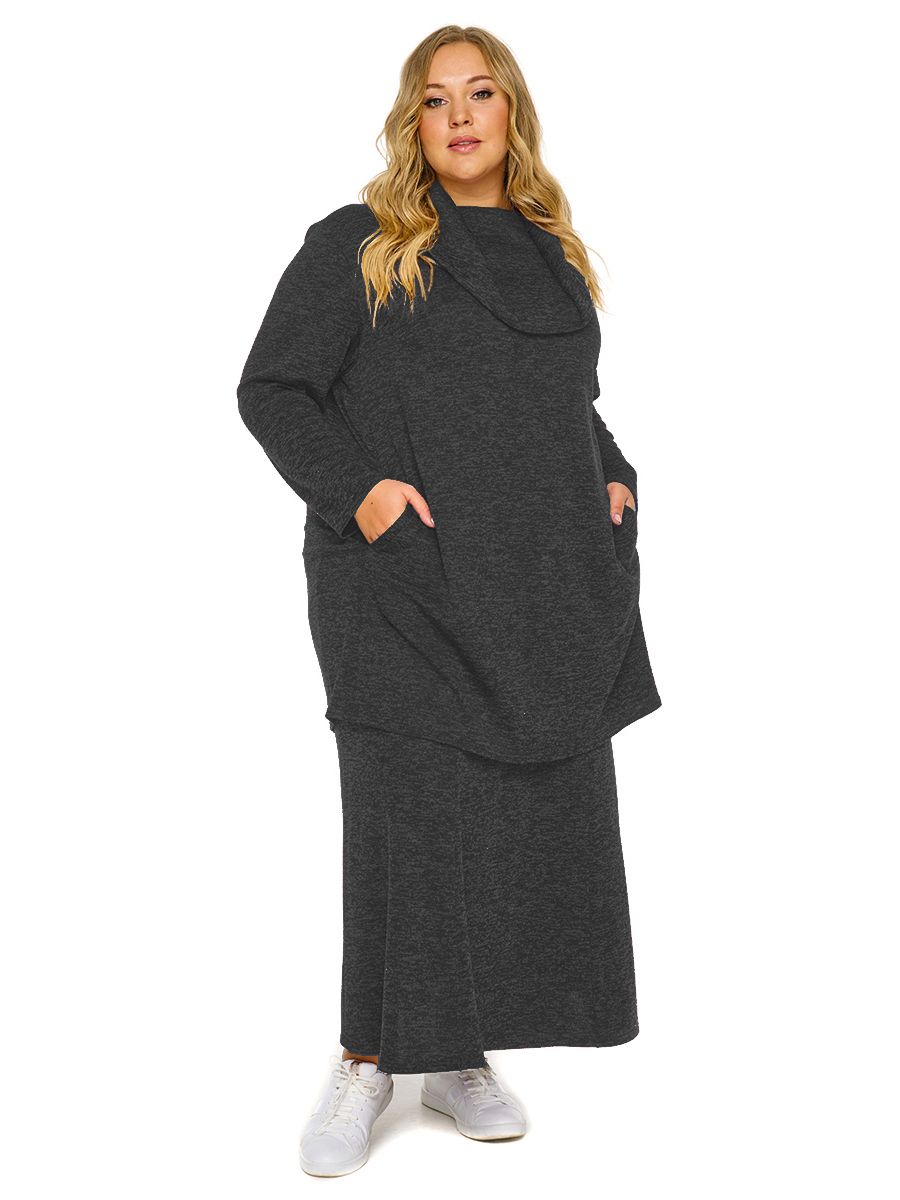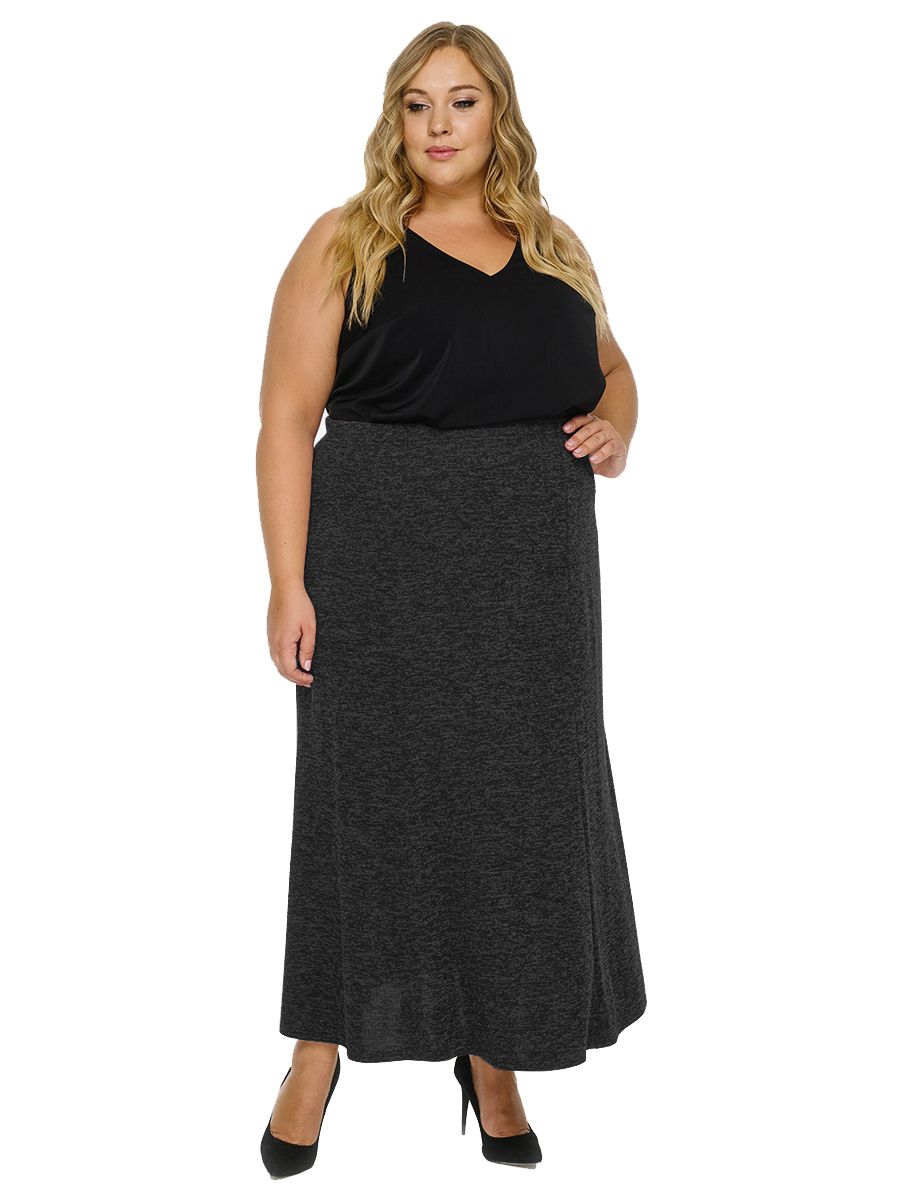 Длинная юбка силуэта годе из меланжевого джерси, на подкладке. За счет клиньев, расширяющихся к низу, юбка зрительно вытягивает силуэт. Верх на широкой резинке, не стесняющей движение.