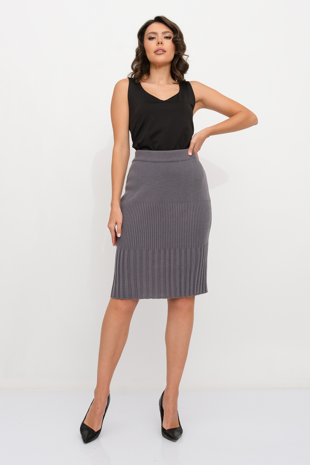 Классическая юбка полуприлегающего силуэта. Переплетение-лапша от узкой по бедрам до широкой по низу изделия. В пояс горизонтально проложена эластичная резинка. серый