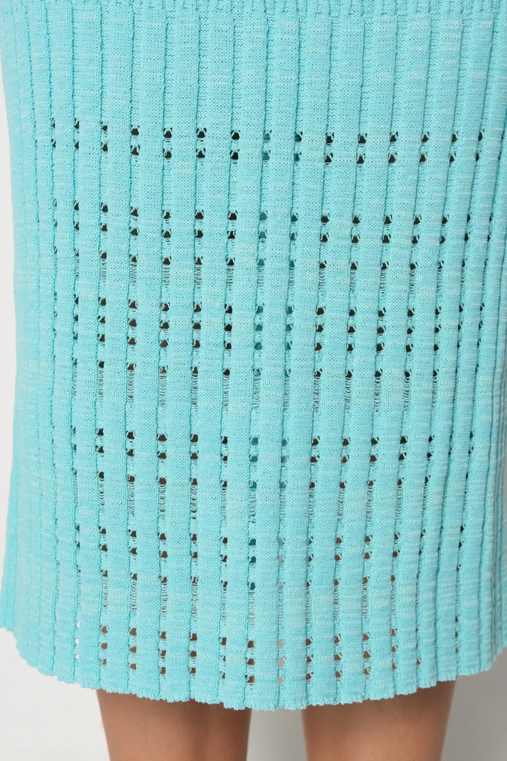 Классическая юбка прилегающего силуэта. Переплетение-лапша от узкой по бедрам до широкой с эффектом перфорации по низу изделия . В пояс горизонтально проложена эластичная резинка. Юбку можно носить в комплекте с джемпером И 023, выполненным аналогичным переплетением и узором. мятный
