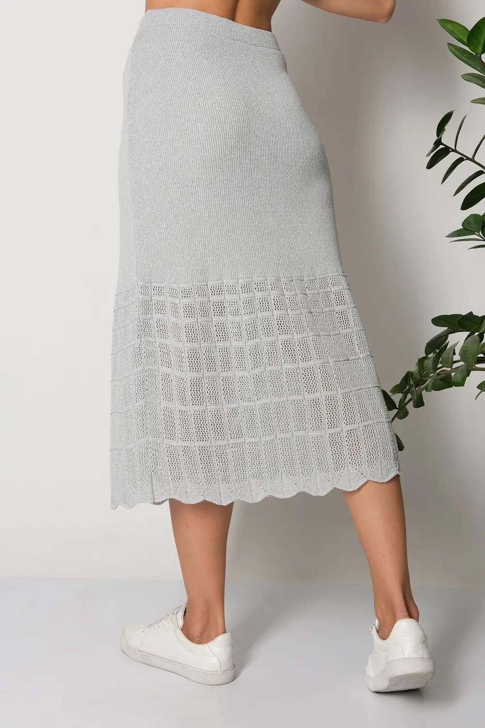 Классическая юбка полуприлегающего силуэта. Ширина переплетения-лапша увеличивается от пояса до колена, нижняя треть юбки выволнена ажурным переплетением. В пояс горизонтально проложена эластичная резинка. Юбку можно носить в комплекте с джемпером И 024, выполненным аналогичным переплетением и узором.