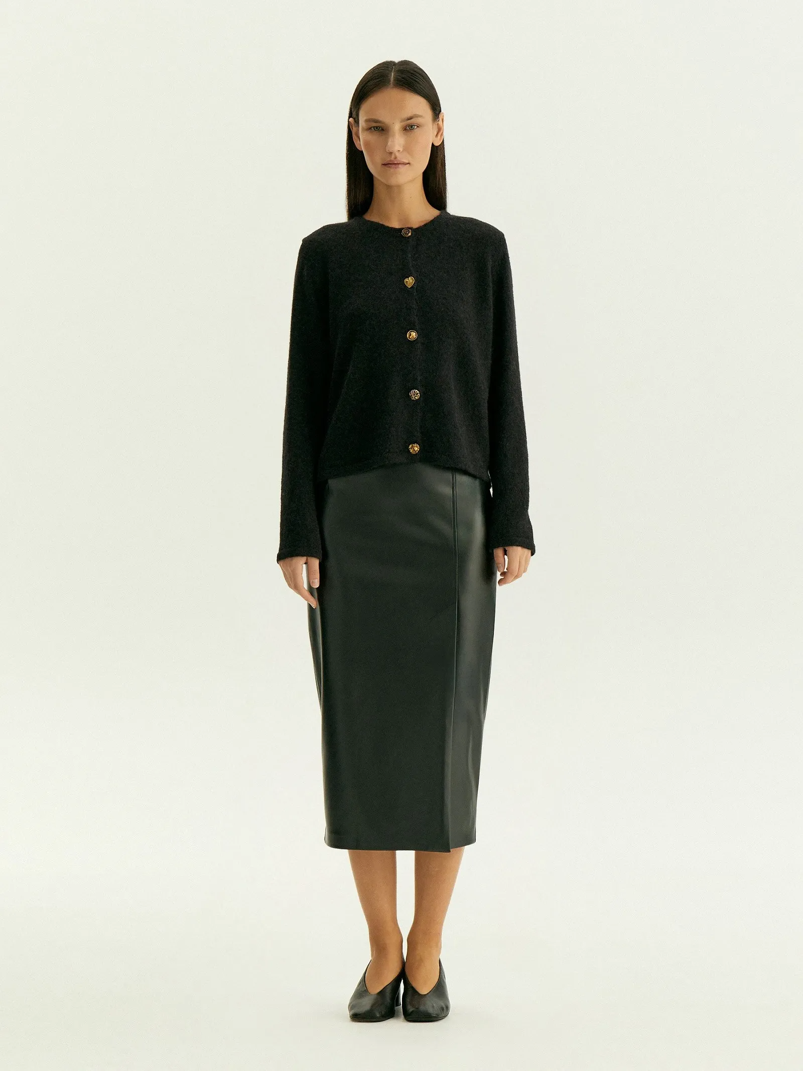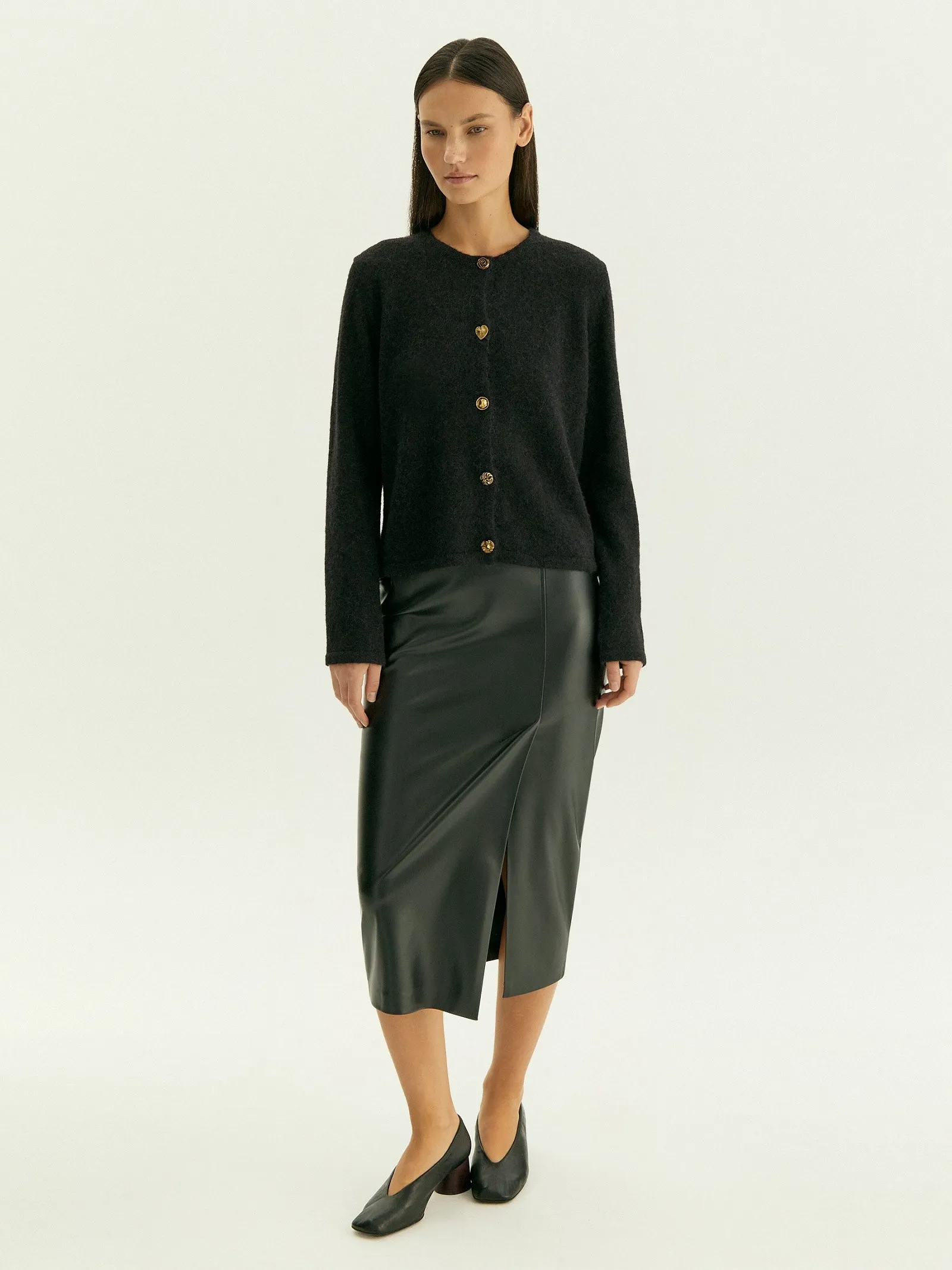 Незаменимая базовая вещь на демисезон. Юбка-карандаш выполнена из качественной экокожи, максимально приближенной по свойствам к натуральной. Практичный материал, универсальный чёрный цвет, элегантный фасон "карандаш" с длиной ниже колена и высокой посадкой делают её отличным выбором на каждый день. Сочетается с любыми рубашками и трикотажем, а также нарядными блузами разных фактур. Модель имеет боковой разрез со шлицей. Выполнена без подкладки.