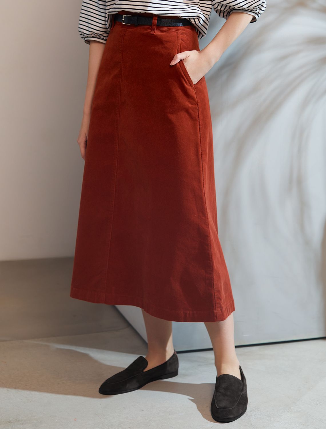 98%Хлопок 2%ПУ Юбка-миди трапециевидного силуэта выполнена из мягкого хлопкового микро-вельвета с добавлением эластана. Изделие комфортно садится по фигуре и не сковывает движения. Модель дополнена высококачественной фурнитурой с фирменным логотипом бренда. Хорошо комбинируется с вязаным трикотажем, блузками и денимом.Также прекрасно станет альтернативой деловым низам в нестрогом офисном дресс-коде.
