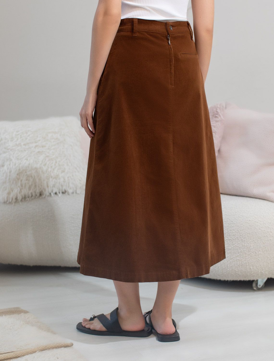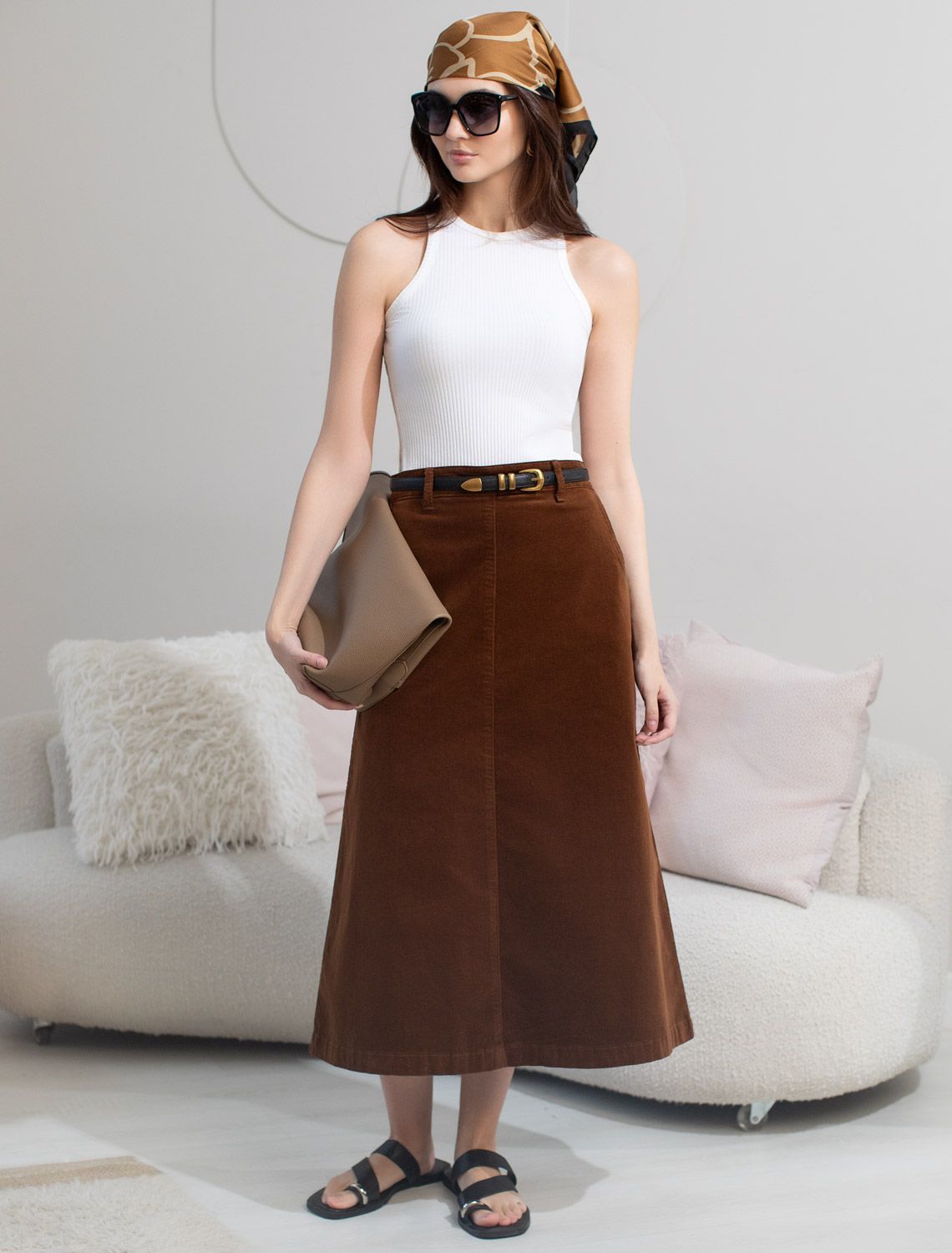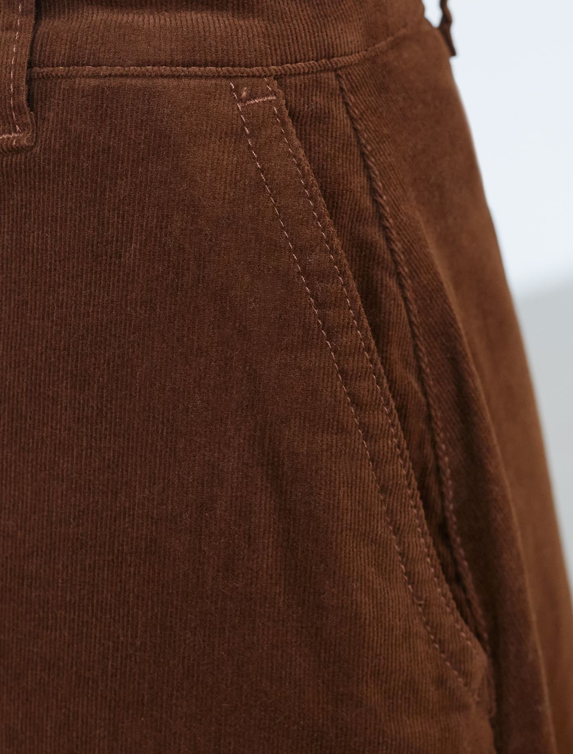 Юбка-миди трапециевидного силуэта выполнена из мягкого хлопкового микро-вельвета с добавлением эластана. Изделие комфортно садится по фигуре и не сковывает движения. Модель дополнена высококачественной фурнитурой с фирменным логотипом бренда. Хорошо комбинируется с вязаным трикотажем, блузками и денимом.Также прекрасно станет альтернативой деловым низам в нестрогом офисном дресс-коде. светло-коричневый