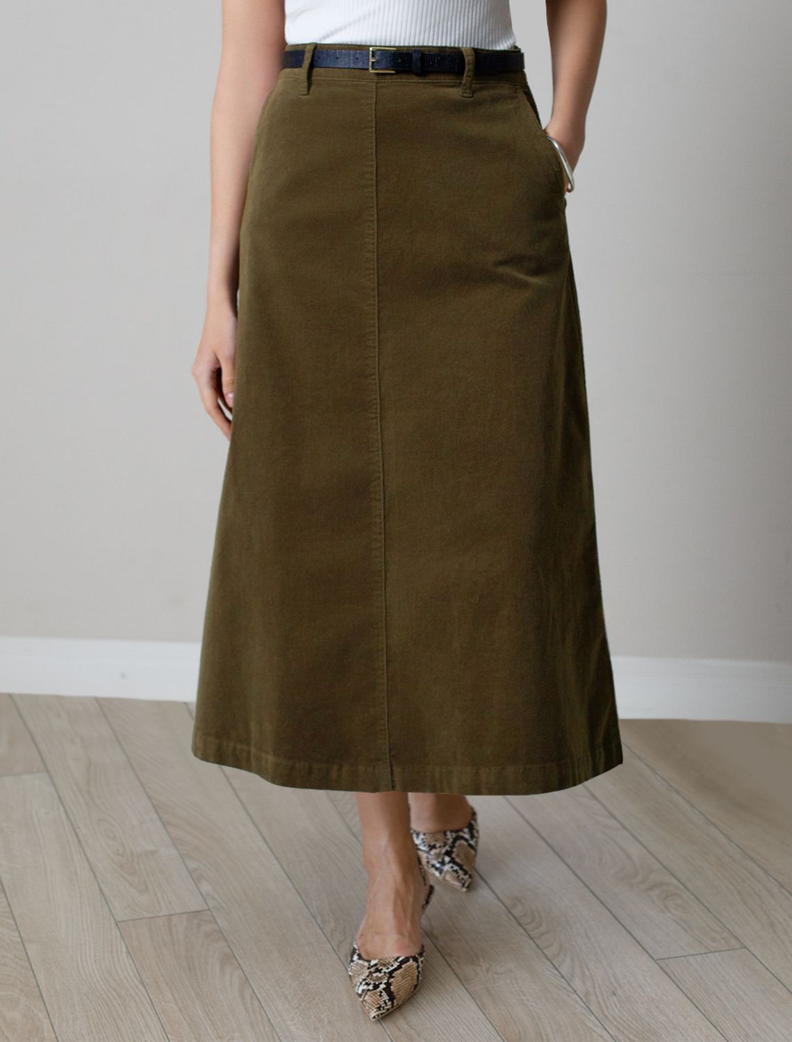 Юбка-миди трапециевидного силуэта выполнена из мягкого хлопкового микро-вельвета с добавлением эластана. Изделие комфортно садится по фигуре и не сковывает движения. Модель дополнена высококачественной фурнитурой с фирменным логотипом бренда. Хорошо комбинируется с вязаным трикотажем, блузками и денимом.Также прекрасно станет альтернативой деловым низам в нестрогом офисном дресс-коде.