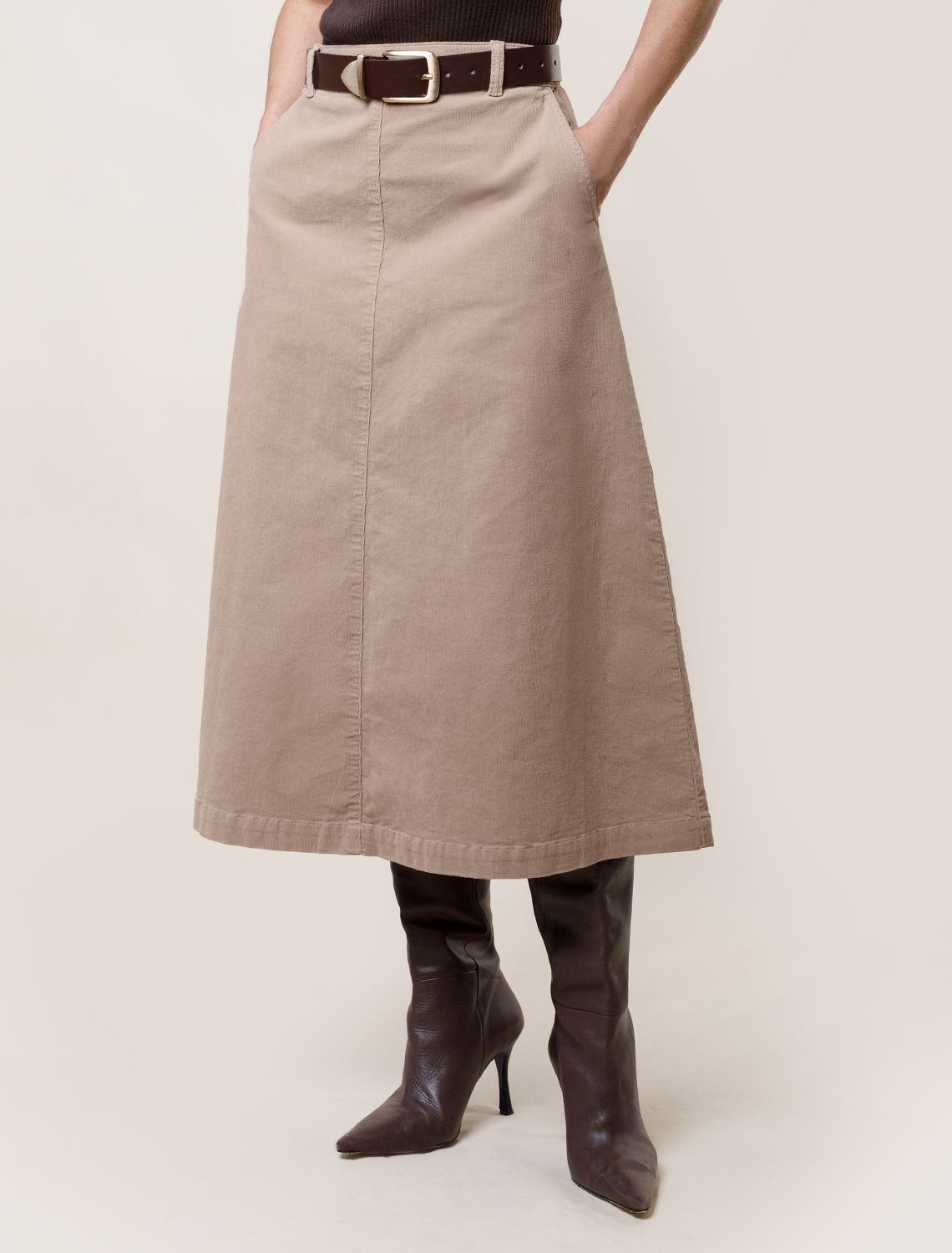 Юбка-миди трапециевидного силуэта выполнена из мягкого хлопкового микро-вельвета с добавлением эластана. Изделие комфортно садится по фигуре и не сковывает движения. Модель дополнена высококачественной фурнитурой с фирменным логотипом бренда. Хорошо комбинируется с вязаным трикотажем, блузками и денимом.Также прекрасно станет альтернативой деловым низам в нестрогом офисном дресс-коде.