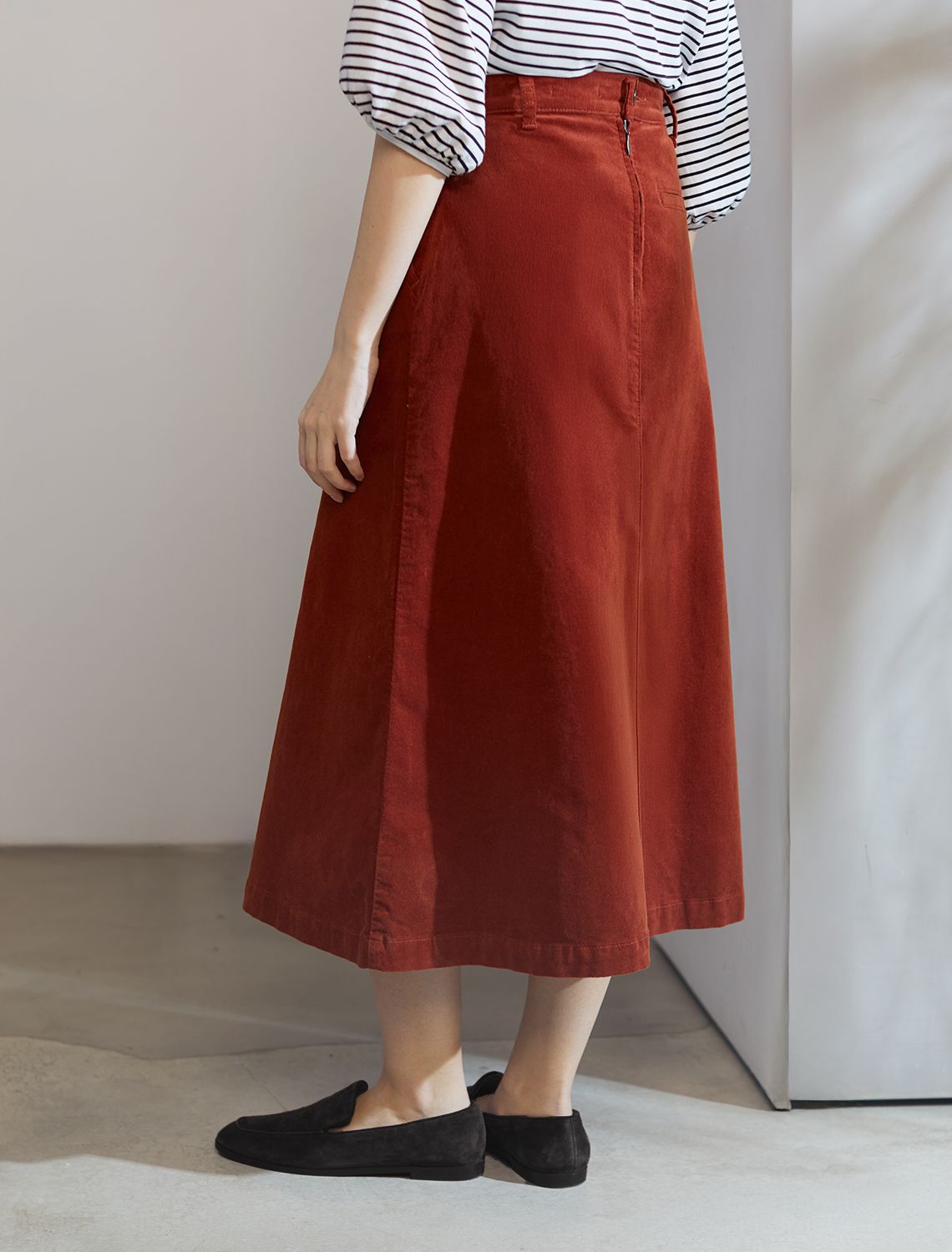 Юбка-миди трапециевидного силуэта выполнена из мягкого хлопкового микро-вельвета с добавлением эластана. Изделие комфортно садится по фигуре и не сковывает движения. Модель дополнена высококачественной фурнитурой с фирменным логотипом бренда. Хорошо комбинируется с вязаным трикотажем, блузками и денимом.Также прекрасно станет альтернативой деловым низам в нестрогом офисном дресс-коде.