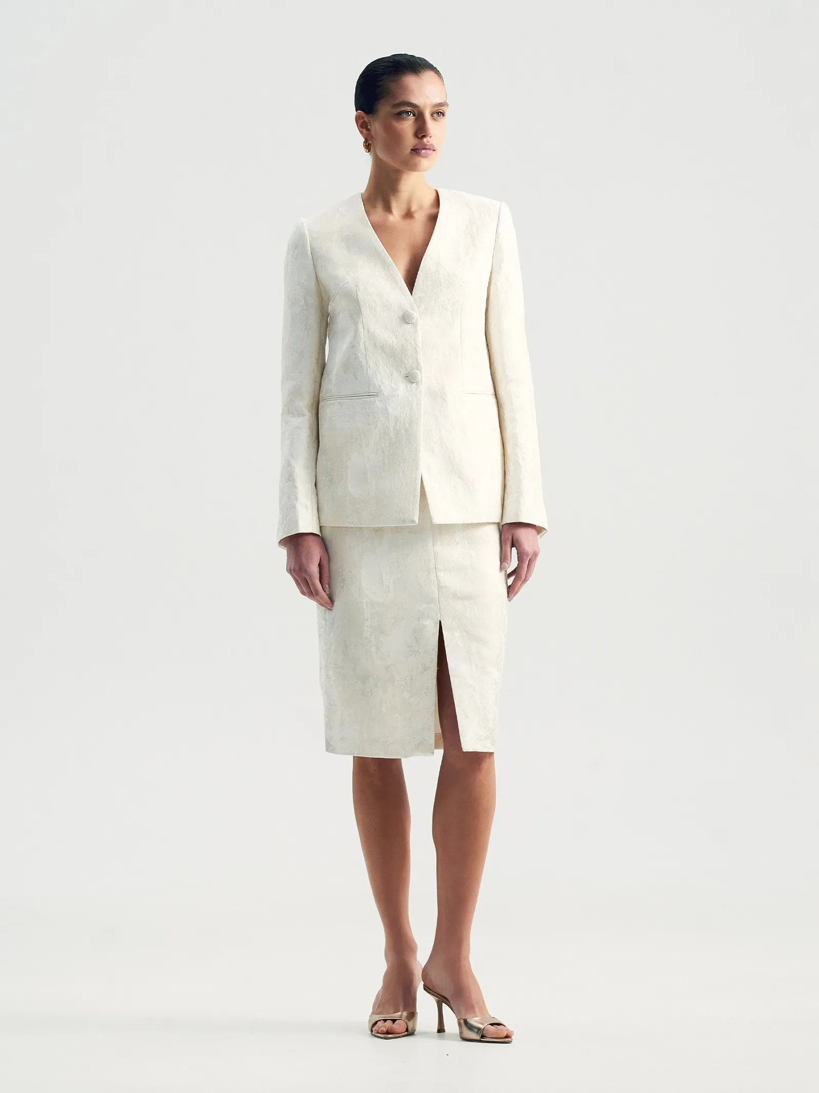 Идеальный вариант для торжественных случаев или для того, чтобы создать себе ощущение праздника каждый день. Юбка-карандаш из роскошного двухтонного жаккарда — кремовый узор на сливочном фоне. Сочетание двух оттенков молочного цвета создаёт дорогой и изысканный образ. Материал наполовину состоит из натурального хлопка. Дополняет жаккард гладкая молочная подкладка с высоким содержанием вискозы. Модель длиной чуть ниже колена имеет разрез спереди. Завершить образ с юбкой можно жакетом из комплекта.