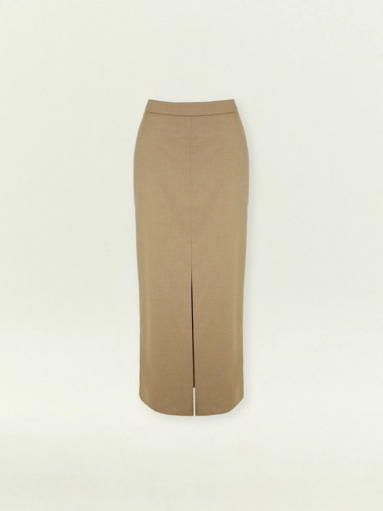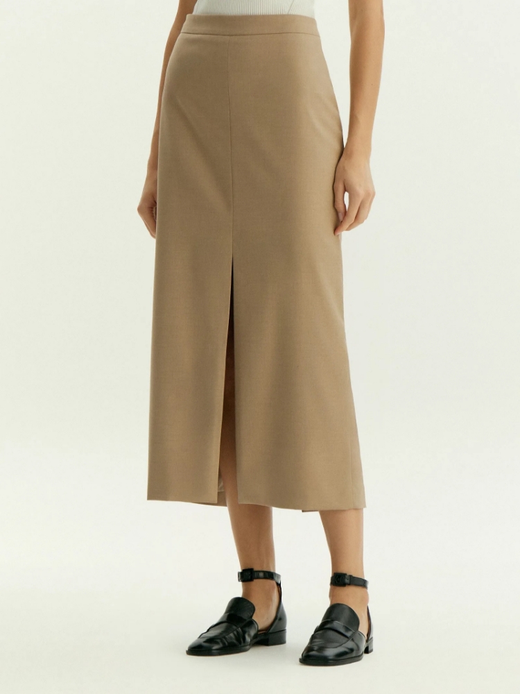 Элегантная базовая юбка на каждый день. Богатый оттенок бежевого сделает деловые образы ещё более стильными. В составе материала — шерсть для тепла, вискоза для мягкости и эластан для комфортной посадки. Юбка-карандаш в длине миди с высокой посадкой имеет разрез спереди. Сделана на подкладке с вискозой. Юбка может стать частью капсулы с брюками и жилетом ant