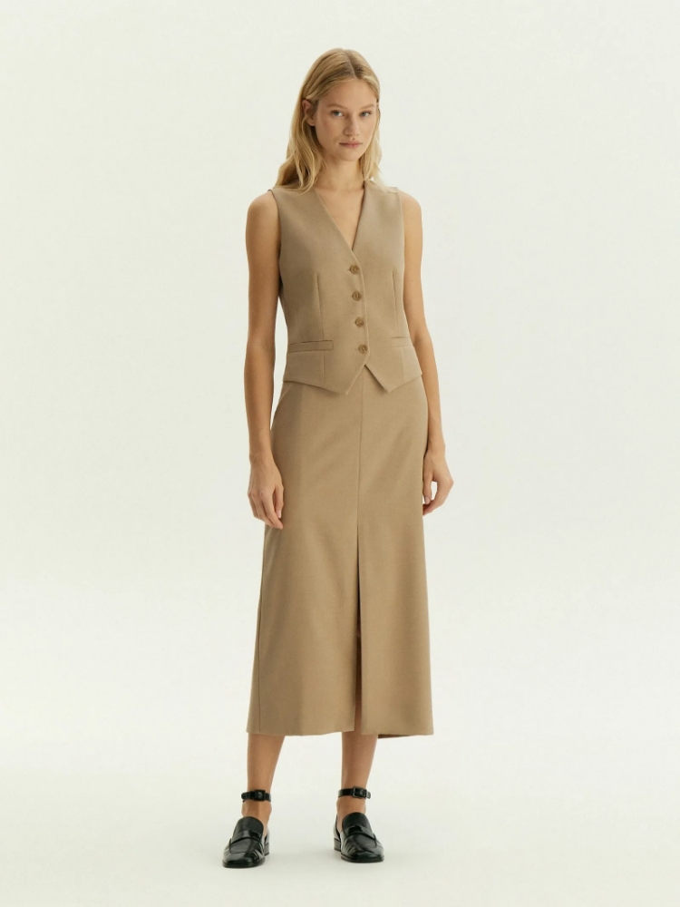 Элегантная базовая юбка на каждый день. Богатый оттенок бежевого сделает деловые образы ещё более стильными. В составе материала — шерсть для тепла, вискоза для мягкости и эластан для комфортной посадки. Юбка-карандаш в длине миди с высокой посадкой имеет разрез спереди. Сделана на подкладке с вискозой. Юбка может стать частью капсулы с брюками и жилетом ant