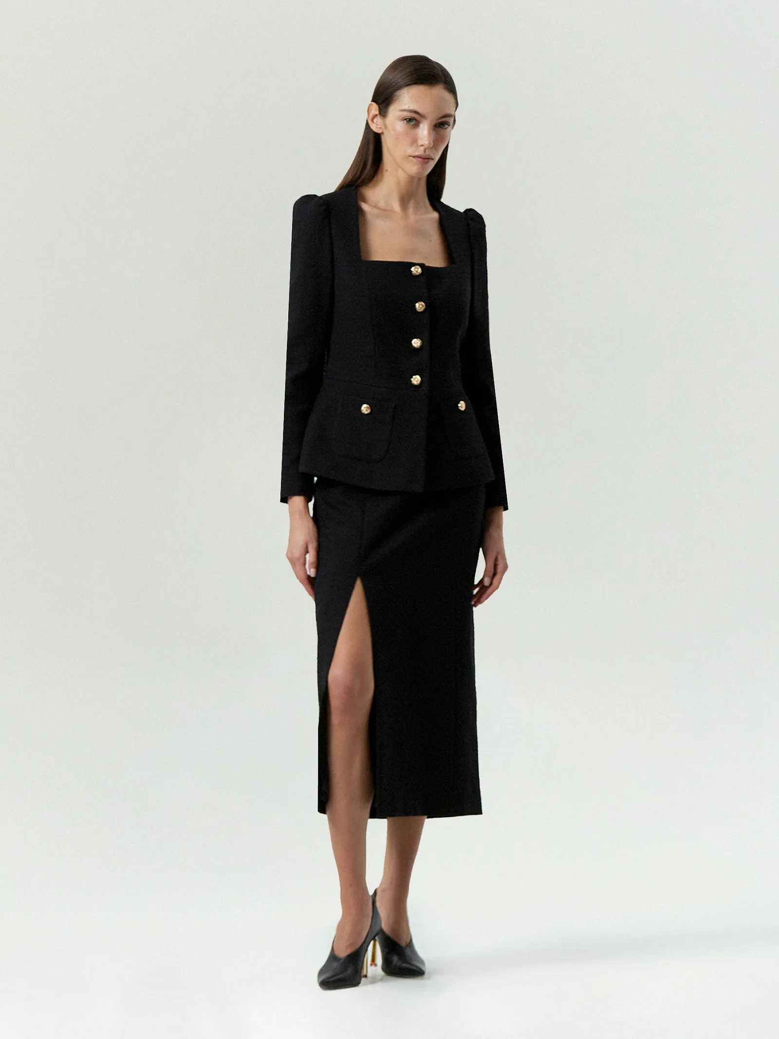 Юбка из чёрного хлопкового твида хороша для нарядных, деловых и даже повседневных образов. Элегантная модель-футляр имеет высокую посадку и длину миди. Дополнена модным разрезом с одной стороны. Застёгивается на молнию сбоку. Сделана на подкладке с высоким содержанием вискозы. Эффектно завершить образ с юбкой поможет жакет из комплекта.