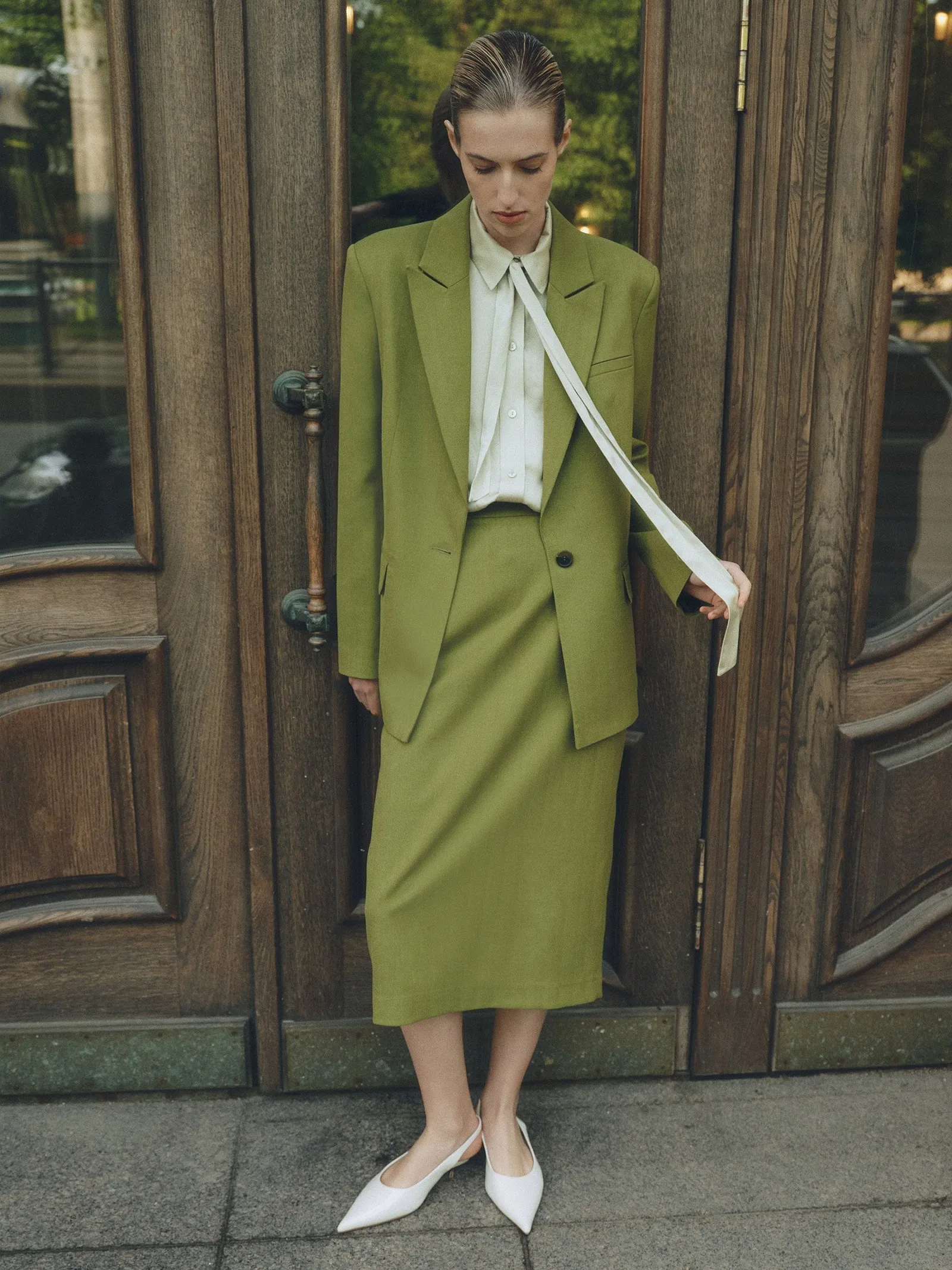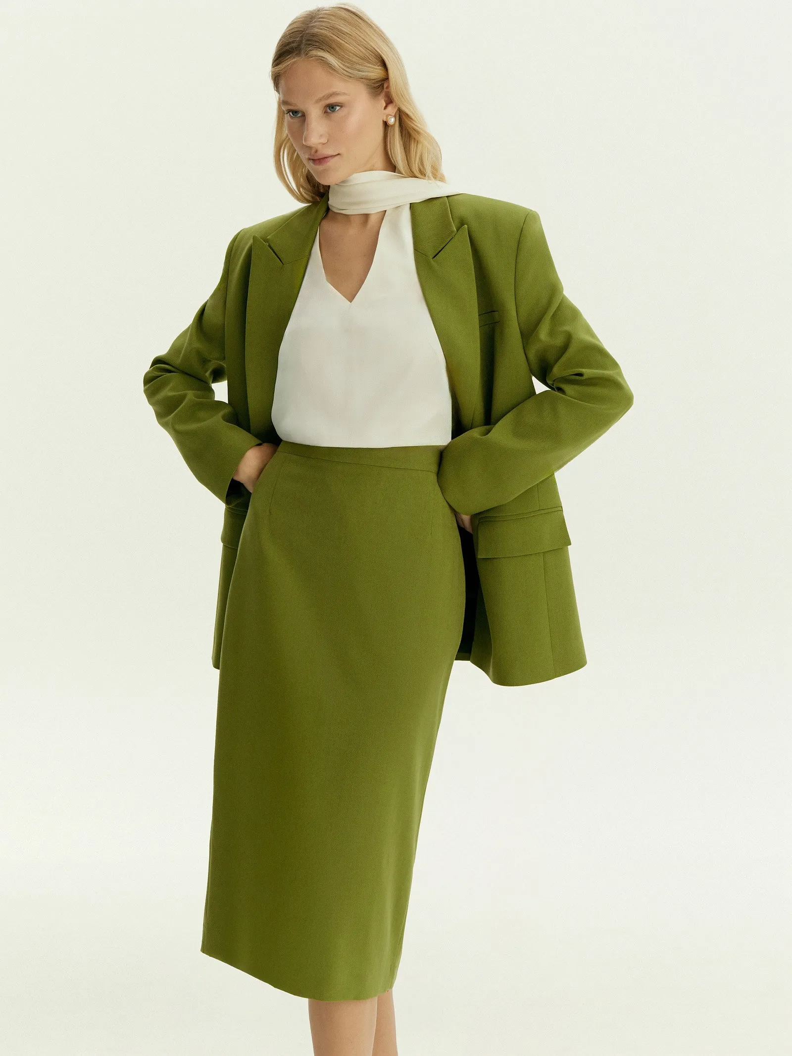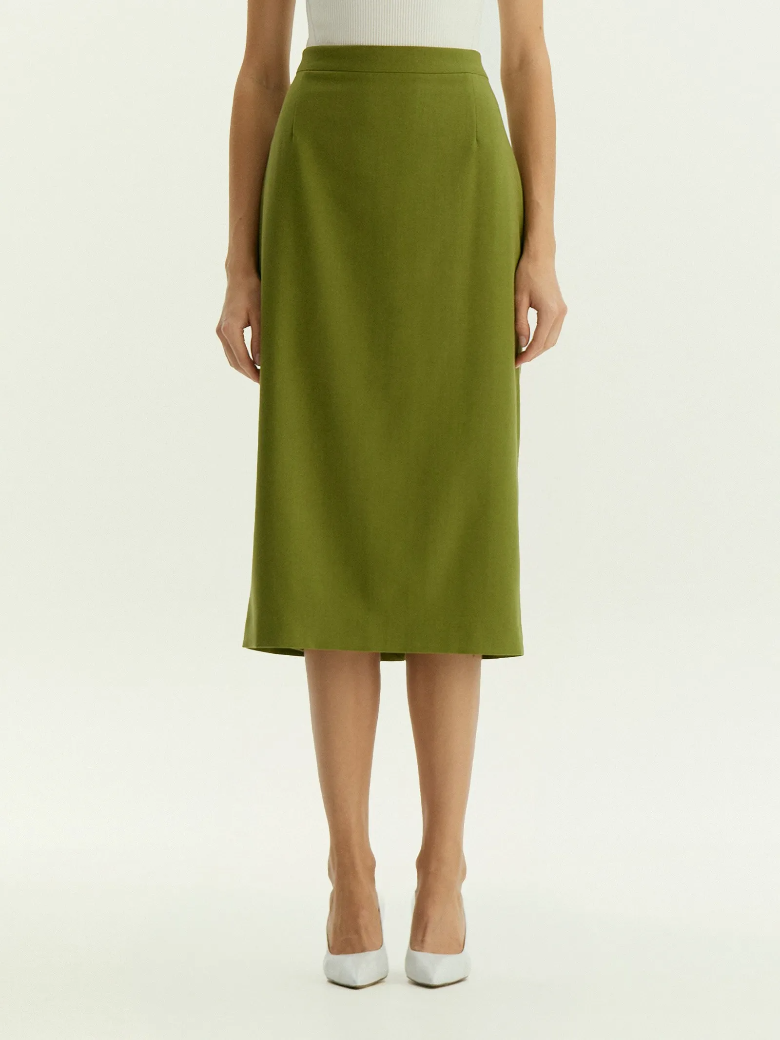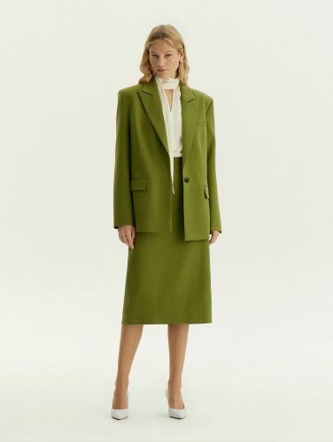 Стильная юбка сочетает в себе тренд и универсальность. Оттенок между лаймовым и оливковым впишется в нестрогий офисный дресс-код, сделает ярче деловые и выходные образы. Материал имеет красивое плетение ёлочкой. Модель выполнена с элегантной высокой посадкой и разрезом со шлицей сзади. Застёгивается на молнию сзади. Юбка сделана из материала с содержанием шерсти для красивого лоска и эластана для комфортной посадки, на подкладке с дышащей вискозой.