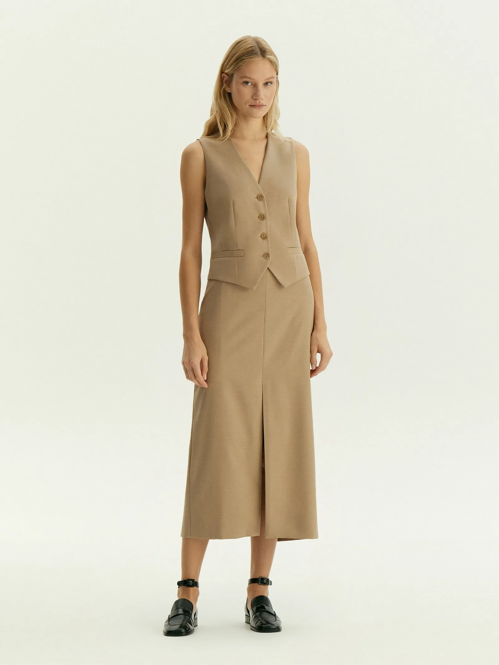 Элегантная базовая юбка на каждый день. Богатый оттенок бежевого сделает деловые образы ещё более стильными. В составе материала — шерсть для тепла, вискоза для мягкости и эластан для комфортной посадки. Юбка-карандаш в длине миди с высокой посадкой имеет разрез спереди. Сделана на подкладке с вискозой. Юбка может стать частью капсулы с брюками и жилетом ant.